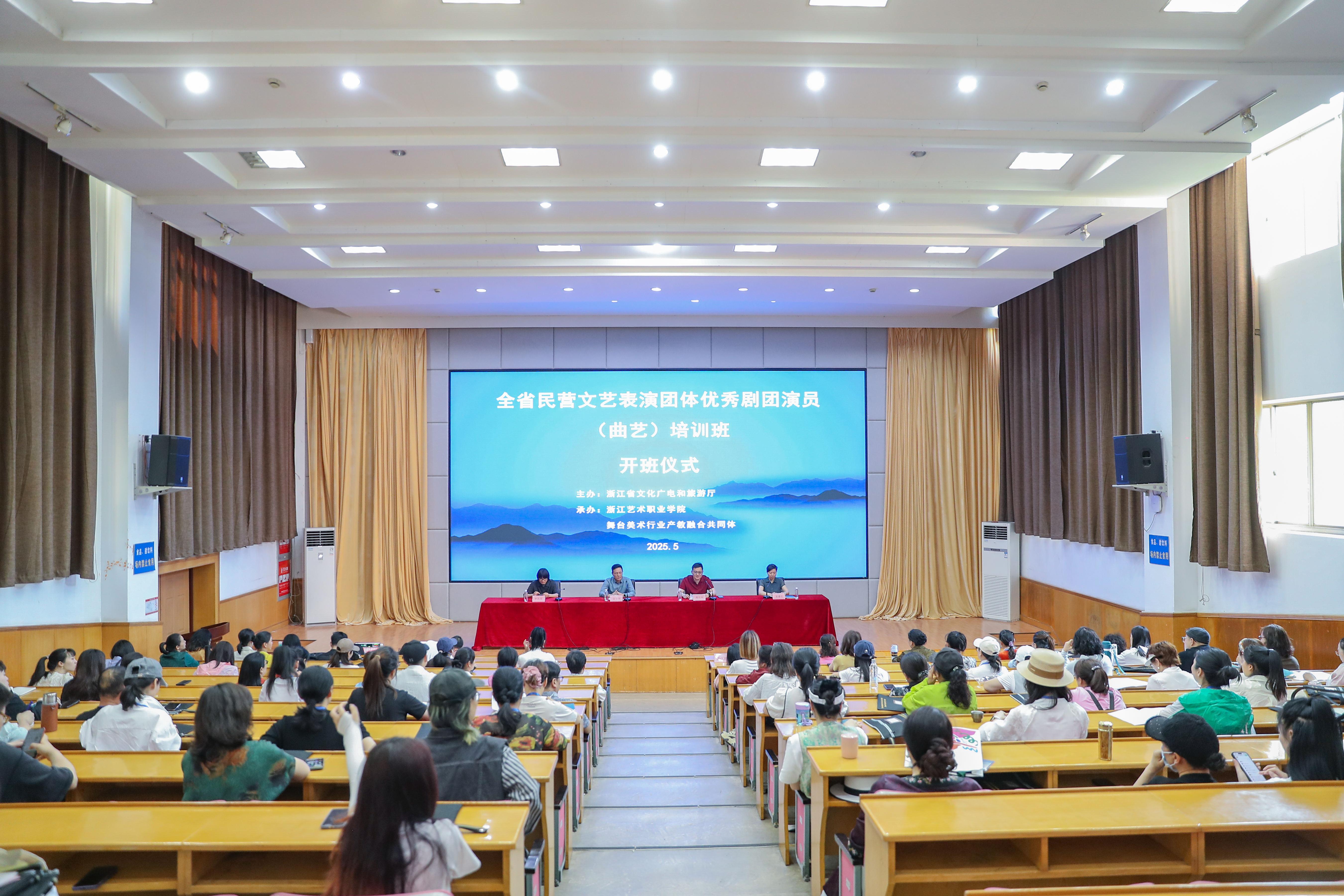 在音乐党课开始前,2025年全省民营文艺表演团体优秀剧团演员曲艺培训班和服装、化妆培训班举行了开班仪式。培训班由省文化广电和旅游厅主办,浙江艺术职业学院承办,来自全省民营文艺表演团体近90位学员参加培训。省文化广电和旅游厅艺术处二级调研员金宇华,浙江艺术职业学院党委委员、组织部部长周应中,设计学院院长李昌国出席开班式,继续教育学院院长吴灌红主持开班式。