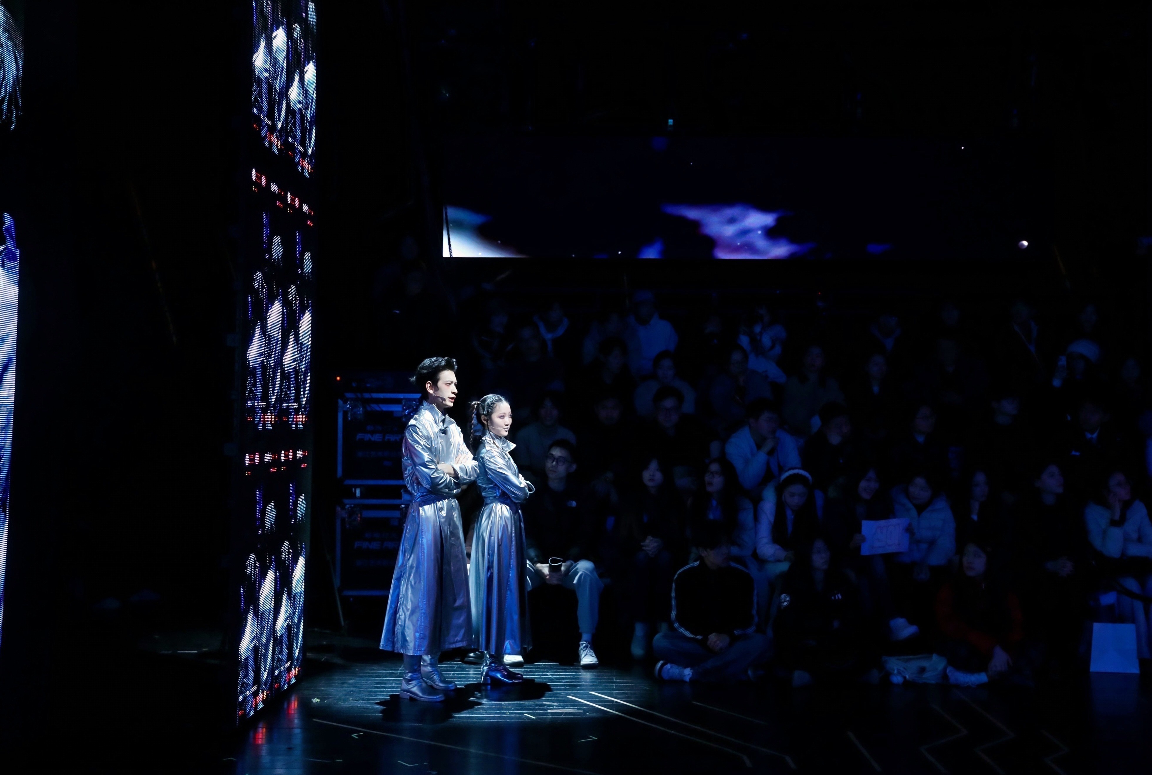 这种深度参与,在表演层面带来了独特挑战与收获。在剧中扮演关键角色的学生演员盛剑鸿对此深有体会:“这个舞台空间和其中融入的交互设计,对我们来说是全新的表演课题。我们不仅要完成角色,更要时刻感知来自两侧观众的目光,以及如何与实时影像产生‘化学反应’。比如在某个涉及抉择的关键场景,灯光、音效和后台的交互线索需要同步触发,这对我们的专注度和默契是极大的考验,但也让表演充满了即时的、真实的张力。”