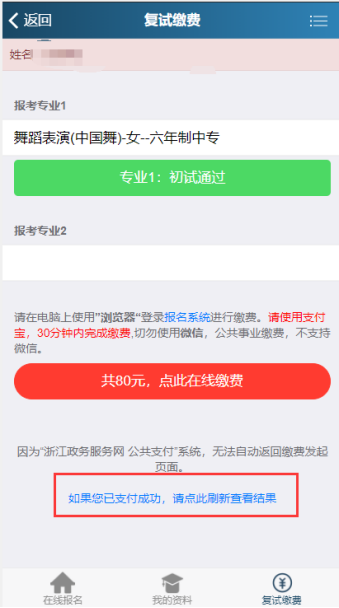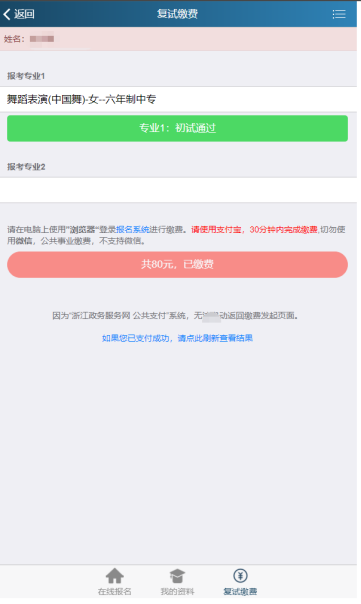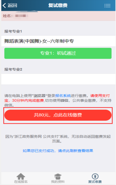 2.考生最多只能报考进入复试专业中的两个专业,请注意专业志愿顺序(采取平行志愿录取)。复试费一个专业80元,两个专业120元(仅支持支付宝缴费);