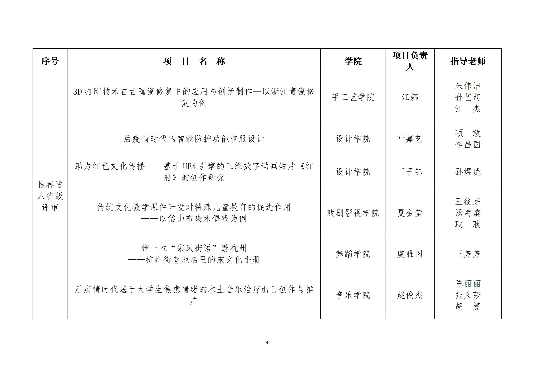 根据《关于组织开展2022年浙江省大学生科技创新活动计划(新苗人才计划)项目申报的通知》(以下简称《通知》)和《关于印发<浙江省大学生科技创新活动计划(新苗人才计划)项目实施办法(试行)>的通知》(团浙联〔2010〕13号)的相关规定与要求,校团委于2022年1月—3月开展了2022年浙江省大学生科技创新活动计划(新苗人才计划)项目申报校内遴选工作,期间共收到各学院申报项目31项。经校内外专家组评审,现根据评审情况拟推荐手工艺学院《3D打印技术在古陶瓷修复中的应用与创新制作—以浙江青瓷修复为例》等6个项目进入2022年度浙江省大学生科技创新活动计划(新苗人才计划)项目省级评审、确定戏剧影视学院《非遗传承·莲花薪传——<冰山上的守候——全国道德模范陈俊贵>曲艺舞台剧编创》等6个项目为校级立项。具体项目情况如下,现予公示。