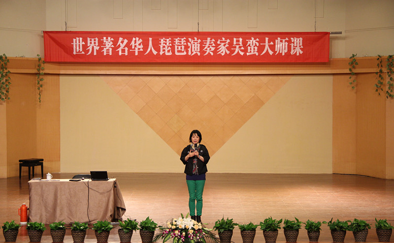 《春江花月夜》、《十面埋伏》、《静夜思》、《九月扬花飞》、《跳吧!》,从传统琵琶古曲到新派琵琶音乐,吴蛮用独特的革新与创举将琵琶介绍到西方,开拓一条“中西合璧,纳古于今”的琵琶之路。课上,她从传统音乐的自信心、合作演奏的新作品和音乐跨界问题这三方面来阐述民乐人如何以独特视角看中国传统音乐在国际中的发展。带着琵琶闯荡天下,没有信心真得难成大家。90年初,美国没有人知道中国传统乐器,也没有人了解中国传统音乐,作为单身一人独闯美国的琵琶演奏家,吴蛮用强大的自信心和扎实的功底,向世界介绍中国的民乐,介绍中国的传统文化。她认为音乐无国界,传统音乐比西洋乐更有发展空间,学生应做好扎实的基本功训练,认真学习,持之以恒,静心感悟,这样定能在音乐道路上有美好的发展前景。在演奏新作品时,她提醒学生不能遗忘传统根基,只炫技巧,要了解整部作品的结构、内容,把握每一次独奏、合奏的机会,多与作曲者交流,让作曲者了解乐器特点,在交流探讨中创造出优秀的作品。如何将琵琶与世界各类音乐跨界合作,创作出既具中国民族特色,又有时尚气息的世界音乐,这需要每位演奏家相互配合,取其精华,这样才能创作出浑然一体、旋律动人、广为流传的世界音乐。现场,为配合演讲内容,吴蛮还播放几段个人跨界合作的音乐作品。当代音乐不仅仅属于西方,它属于全世界,属于全人类。在演讲中,她无时无刻都传递着这样一个信息:传统即是国际。