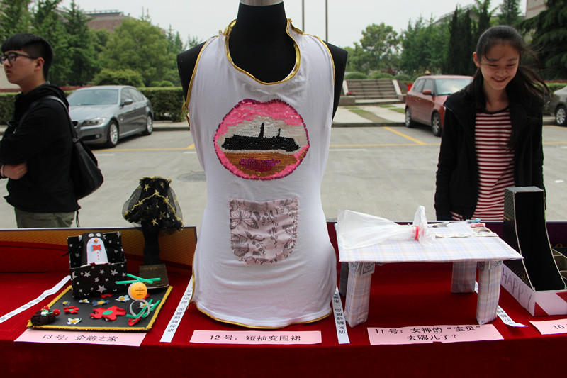 4月24日中午,教学楼八号楼前人头攒动,热闹非凡。参加“旧物改造”生活DIY大赛的二十四件作品在展位上一字排开,等待着大众投票。本次比赛旨在为学生的创新能力、动手能力和合作能力提供一次锻炼和展示的机会,让大家在体验合作历程中,加强环保意识,从自身做起,从身边做起,一同为环保和谐校园做贡献。进行“旧物改造”的原材料均为废旧的学习、生活用品,经过装饰、拼接、剪裁、重构,新产品富有创意,体现美化、装饰、实用等价值。
