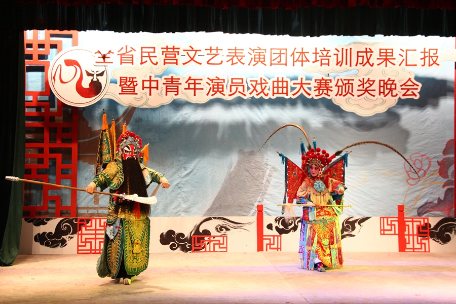 晚会现场气氛热烈,众多戏剧爱好者前来观看。各民营剧团群英荟萃,精彩纷呈。开场越剧《穆桂英挂帅》气势磅礴,彰显巾帼不让须眉的风范;越剧《金玉良缘》贾宝玉的演唱十分到位,神态动作极具传神;最出彩的还数这次大赛的金奖第一名得主京剧《芦林坡》中的扈三娘饰演者齐秀坤,她一对日月神刀虎虎生风,或跳跃,或高空翻,还有蹦子等高难度动作。这位已40多岁的演员学习京剧已有30年了,曾在河北艺术学校学习,由于对戏曲的喜爱,所以坚持走到现在,在这过程当中,受过很多伤,还经常带伤上台表演,一些名家、老师都夸她练功刻苦,学得很快。她在演出前接受采访时表示,这次来参加比赛,也是锻炼的机会。当晚另一亮点则是“反串”表演,一贯是女串男的越剧,这次居然有男穿女,而且演唱高难度的《双玉蝉》,“菱花镜……”声音婉转,跌宕起伏,控制得极好;还有女包公,自己化妆,自己唱,当主持人问道,为什么喜欢演关公、包公这些角色,女包公说道,因为这些角色充满正气。