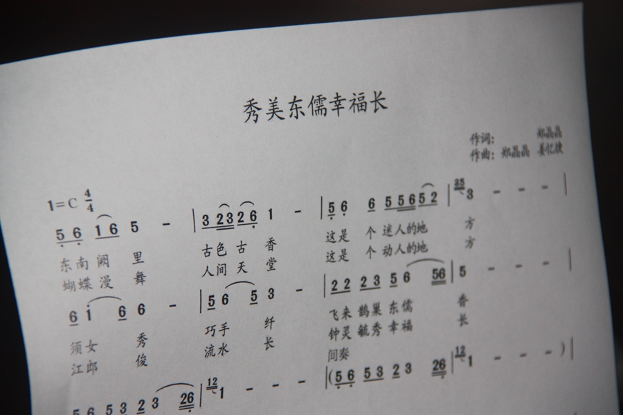 毛村山头村前任周书记向大家介绍道:村歌代表的是我们村的精神风貌,我们都很喜欢,我们歌唱天蓝、地绿、水清、人和。但每次参加村歌比赛时都拿不到很好的奖项,主要原因是我们还不够专业,希望在水平上有更大的提高。