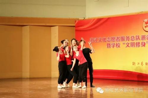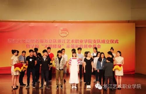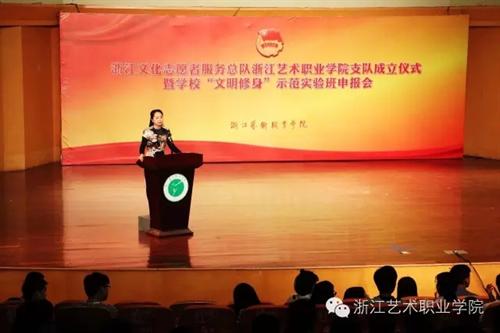 5月4日9:30,浙江文化志愿者总队浙江艺术职业学院支队成立仪式暨学校“文明修身”示范实验班申报会在学校音乐厅举行。院长张建国、党委副书记黄杭娟,学校相关职能处室、各系部党总支负责人出席,院系两级团学组织负责人,各班班长团支书等400余人参加活动。活动由音乐系党总支副书记、副主任,院团委书记章蔓丽主持。