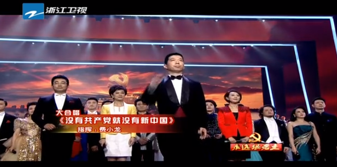 整场演出的合唱板块均由孙建国老师编配音乐。合唱团合唱的《井冈山风云》、《过雪山草地》、《地道战》、《七律·人民解放军占领南京》等用嘹亮的歌声和慷慨激昂的情感描绘了中国共产党的风云史;钱思舒老师等演唱的《在希望的田野上》柔美动听、沁人心田 ;2016届毕业生王璟等演唱的《美丽浙江》把浙江的美丽化作一个个美妙的音符,融入歌声。最后由省委书记夏宝龙等省领导和台上台下演员、观众一齐合唱的《没有共产党就没有新中国》給整场演出一个完美的落幕,合唱的指挥是费小龙老师。