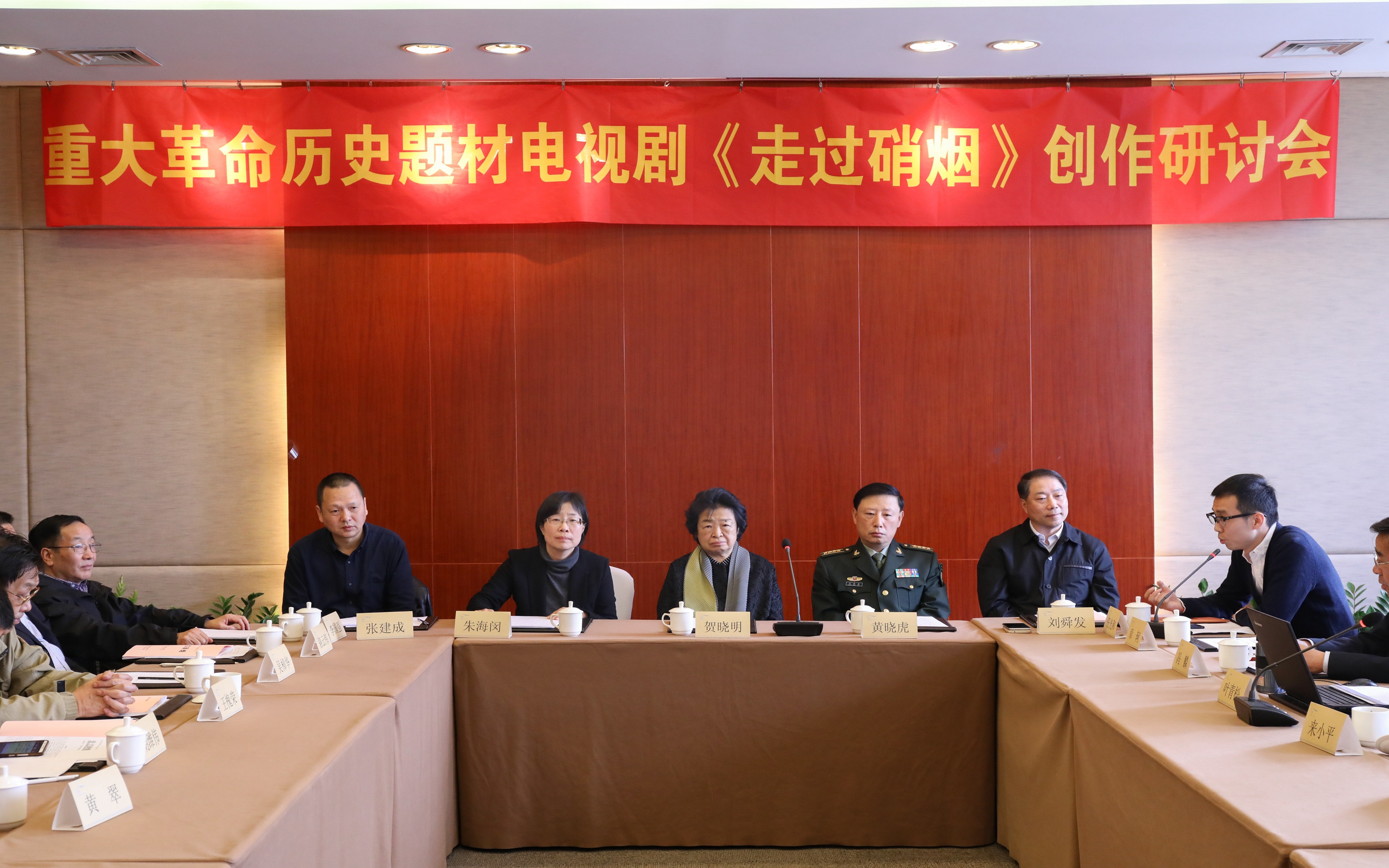 朱海闵在研讨会上致词。她说,《走过硝烟》是一部有英雄气质的电视剧。战火连天戎马倥偬的时代尽管已远去,但我们将它拉回视野,重捡起那些历史细节,革命前辈坚定崇高理想信念,为了国家和人民,用英勇斗争的革命精神和刚烈无畏的行动争取胜利,依然震撼着我们。今年是中国人民解放军建军90周年,我们创作这部电视剧,对回望历史不忘初心有着时代价值和意义。习近平总书记在中国文联十大、中国作协九大开幕上强调,歌唱祖国、礼赞英雄从来都是文艺创作的永恒主题,也是最动人的篇章。我院影视创作水平不断提高,原创电影在国内外影展中屡屡获奖,为更好地与产业接轨,也为我院相关专业师生搭建一个实践的平台,本次创作通过多元方式,联合社会优势创作力量,希望打造出一部有担当有社会责任感的影视精品。