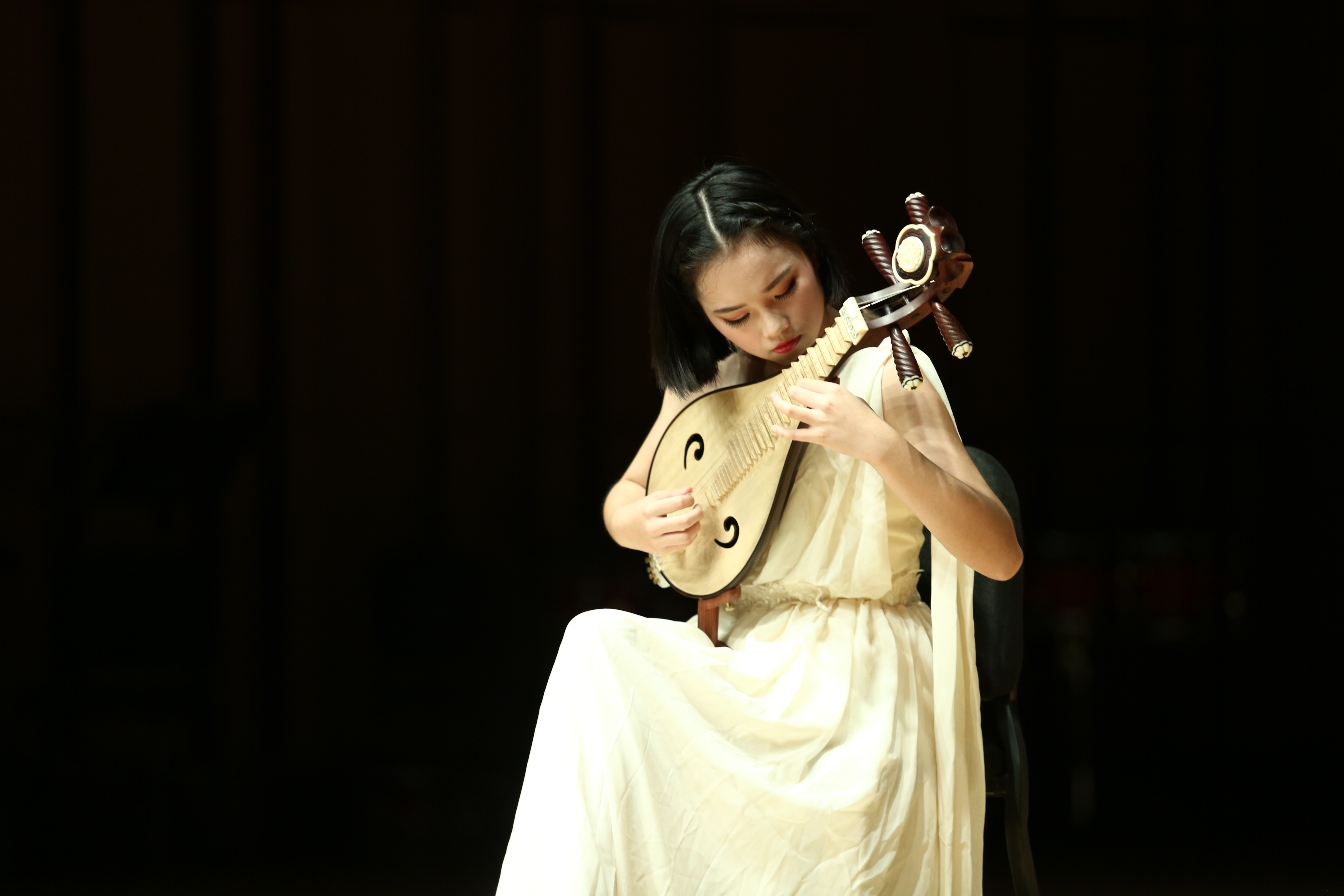 当天下午,不期而至的暴雨犹如展演的前奏,嘈嘈切切,与各个排练厅传出的乐声相应和。我院附中高二学生龚力娅在指导老师祝杭红带领下也在排练厅为下午演出作准备,她的柳琴独奏在第三场。《澳门狂想曲》是她打磨了一个学期的乐曲,技巧复杂,需要很高的音乐表现力。柳琴在民乐弹拨乐器中属高音乐器,音响效果独特,龚力娅已习练6年。她在台上时而“轻拢慢捻抹复挑",时而“嘈嘈切切错杂弹",声音低处几不可闻,高处如骤雨激荡,一曲终了掌声雷动。