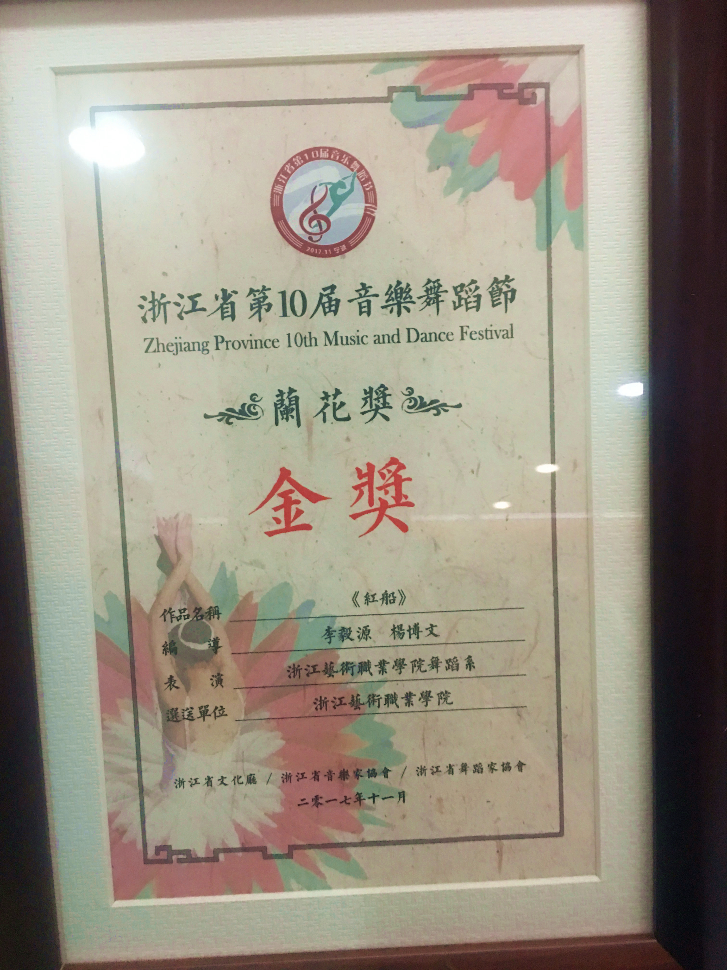 由舞蹈系青年教师李毅源、杨博文编导的群舞《红船》此次获得舞蹈类金奖第一名,也是实至名归。作为献礼党的十九大的诚心之作,以嘉兴南湖红船为故事背景、意象性的动作语言来表达对未来新社会憧憬的《红船》,已然成为近年来我省舞蹈界涌现出的一部经典佳作,征服了评委和观众,代表了浙江省舞蹈艺术近几年发展的最高水平。之前该作品已连续两年荣获2016浙江省大学生艺术节、2017浙江省大学生艺术节舞蹈类专业组金奖,不久前又刚荣获2017首届“浙江风格 江南舞韵”作品展演“十佳作品(综合最高奖)”奖,这次再收获一枚音舞节的金质奖章,可谓锦上添花、众望所归。