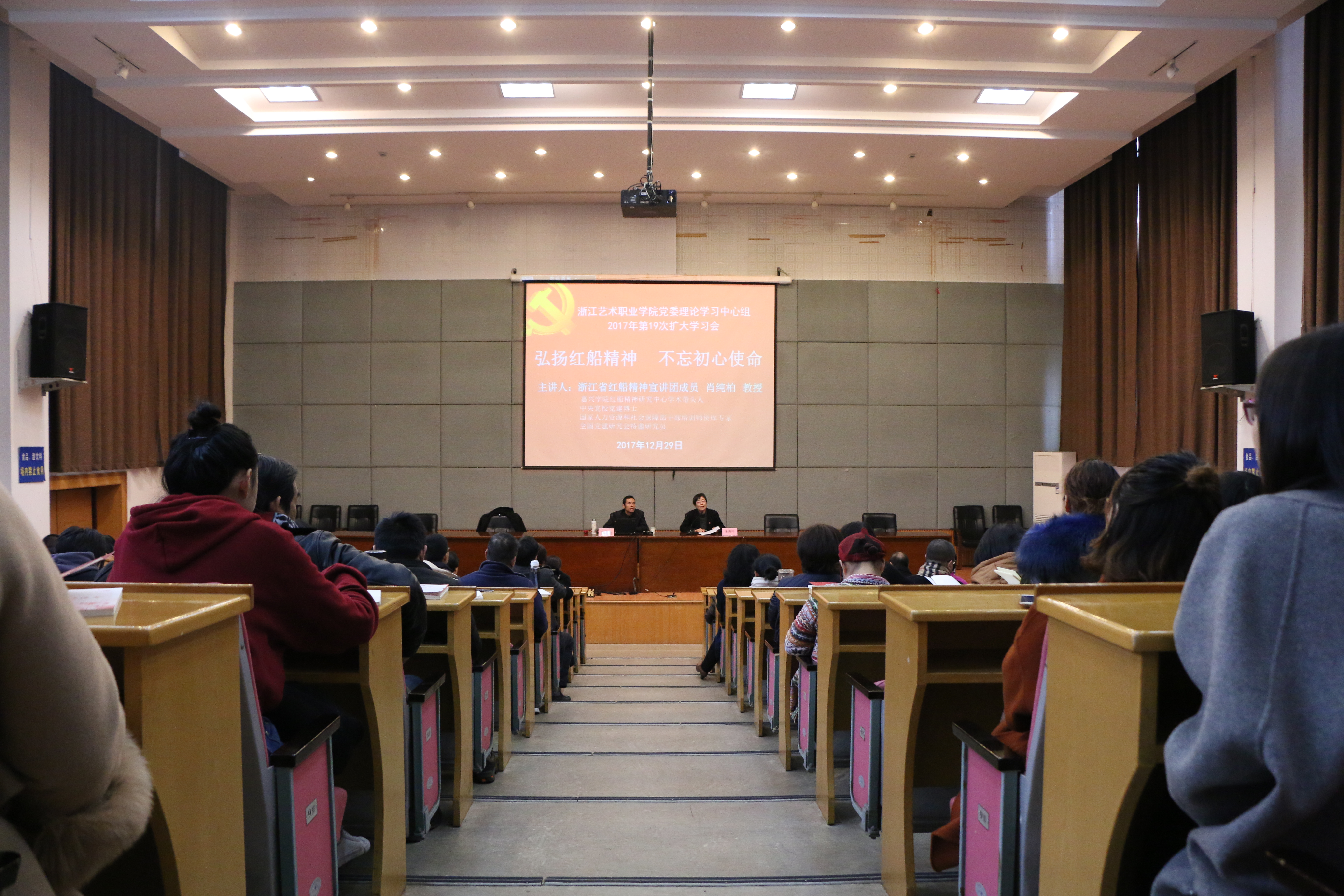 “秀水泱泱,红船依旧;时代变迁,精神永恒。”“只有不忘初心,牢记使命,永远奋斗,才能让中国共产党永远年轻。”2017年12月29日,浙江艺术职业学院举办“弘扬红船精神 不忘初心使命”主题报告会暨2017年第19次党委理论学习中心组扩大学习会,特邀浙江省红船精神宣讲团成员、嘉兴学院红船精神研究中心学术带头人、中央党校党建博士、全国干部培训教材审读专家、国家人力资源和社会保障部干部培训师资库专家、全国党建研究会特邀研究员肖纯柏教授作“弘扬红船精神 不忘初心使命”专题讲座。党委书记朱海闵主持报告会,校党委班子成员黄杭娟、章轲、沈恒、夏开堂、沈军甫,处科级干部、全体党员、教职员工100多人参加学习。