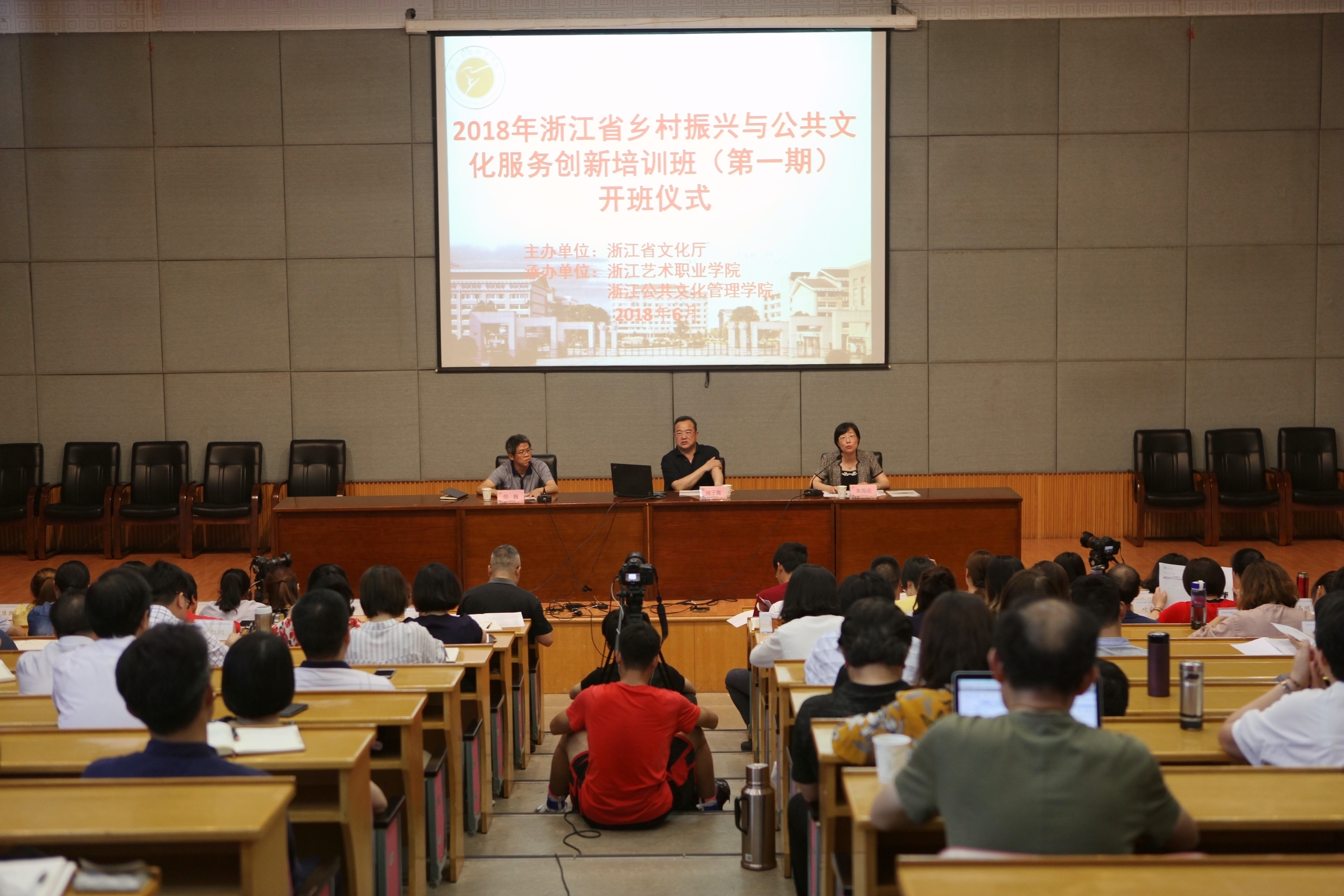 为推进文化助力乡村振兴,根据浙江省文化厅2018年干部培训计划要求,由浙江省文化厅主办、浙江艺术职业学院承办的2018年全省乡村振兴与公共文化服务创新培训班(第一期)6月19日下午在图信中心报告厅开班。浙江省文化厅党组书记、厅长褚子育出席开班仪式并作首场讲座,省文化厅公共文化处处长倪巍主持开班仪式,浙江艺术职业学院党委书记朱海闵主持讲座。全省乡镇(街道)文化工作分管领导、省级文化系统兄弟单位领导和校党委班子成员、处科级干部共同聆听专题报告会。