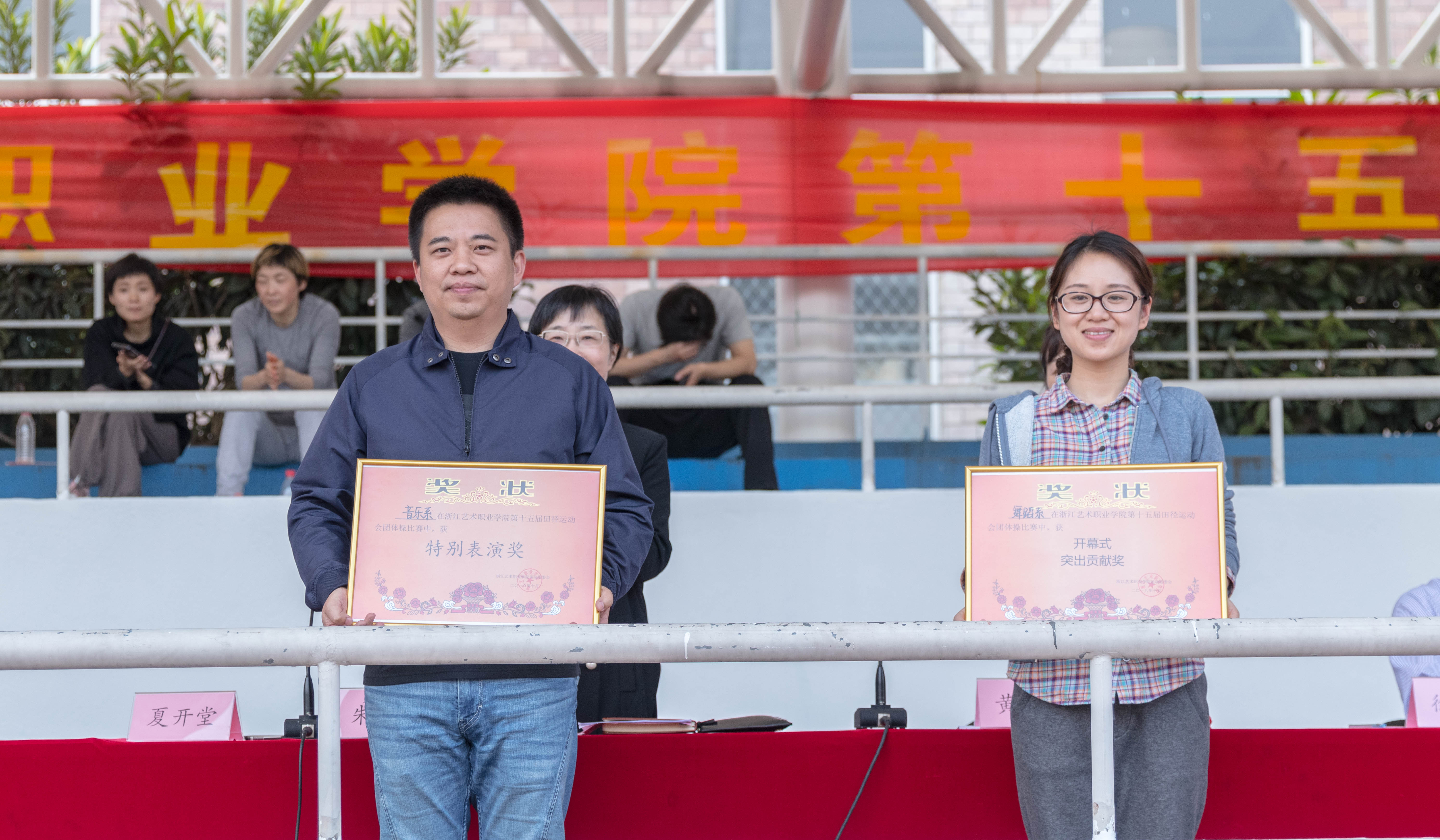 惠风和畅,秋阳高照,10月26日下午,浙江艺术职业学院第十五届田径运动会在两天激烈的赛事竞逐后迎来闭幕式。校领导朱海闵、黄杭娟、夏开堂、徐芳、沈军甫、王涛、马向东及各系运动健儿们参加闭幕式。校党委副书记夏开堂主持闭幕式。本届运动会有695名体育健儿进行了30个项目的比赛,共决出3个团体项目奖,27个单项奖,2个“体育道德风尚奖”,1个“团体操特别表演奖”,1个“开幕式突出贡献奖”和2个“集体协作奖”。