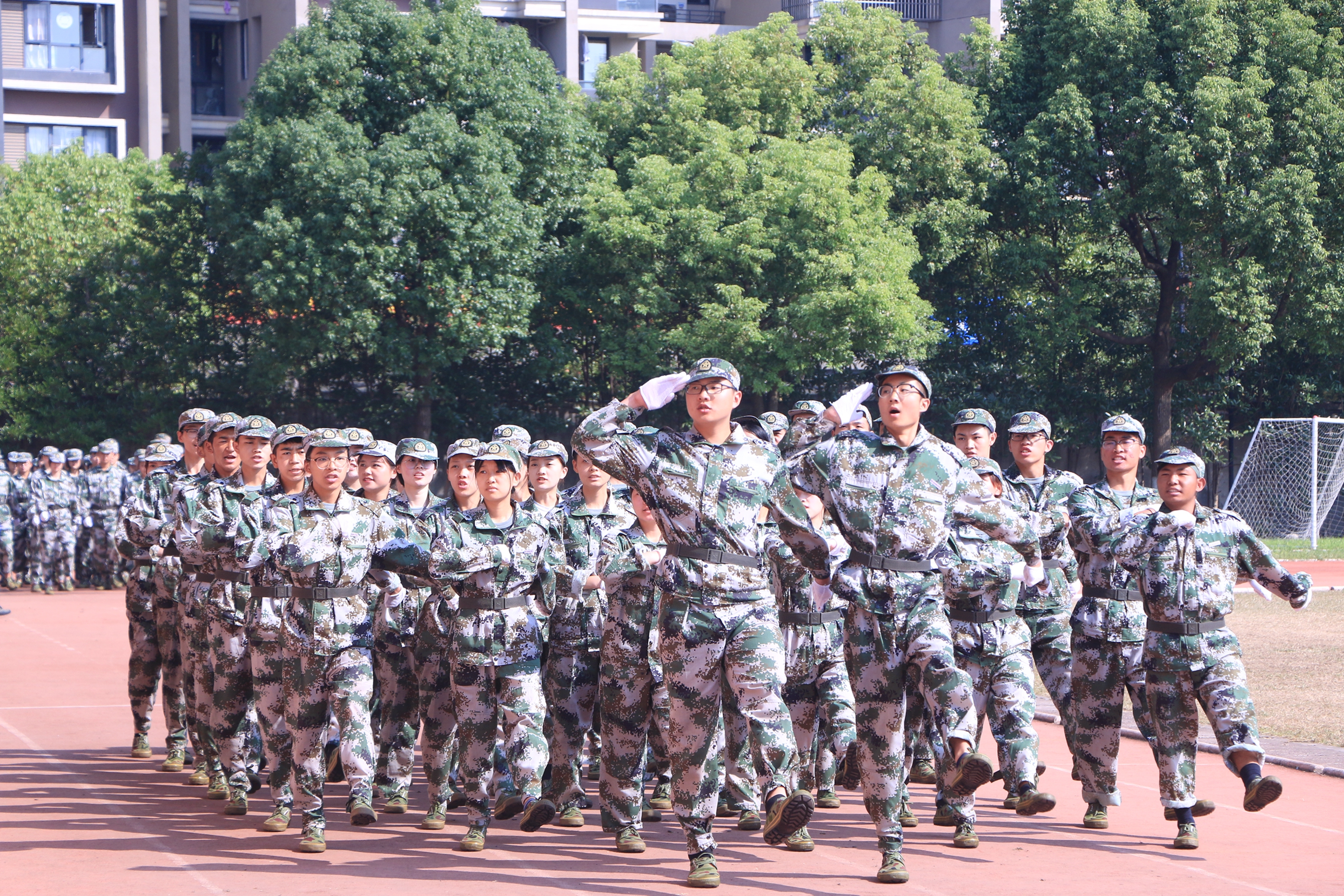 《义勇军进行曲》响起,全体新生用坚定的眼神凝望五星红旗缓缓升起,闭训仪式随即拉开大幕。党委副书记夏开堂代表学院党委检阅了新生军训队伍。各营排进行分列式军训汇报,“提高警惕,保卫祖国;扬帆把舵,奋勇拼搏,看我一排,气势磅礴;牢记担当,百炼成钢,再创辉煌……”,嘹亮的口号声在田径场上空回荡,这是发自内心的声音,响彻天空。经过军训的洗礼,同学们步伐有力、英姿昂扬,将这半月所学所练一一展现。方阵表演吸人眼球,军体拳表演、队列表演、战术表演,这支由各系最精英的成员组成的方阵,以精湛的军训动作展示,向老师和同学们致敬。