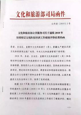 近日,文化和旅游部公共服务司通报了2018年全国基层文化队伍培训工作绩效评价结果,浙江省文化和旅游厅、浙江艺术职业学院双双获评“优秀”等次。这也是文化和旅游部自2016年实施绩效评价工作以来,我校连续三年被评为“全国基层文化队伍培训工作优秀单位”。今年除了国家培训基地外,我校位列各省市基地第一。