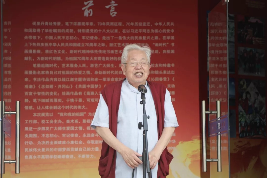 钱法成致辞。他表示,非常高兴来到浙艺和师生们共同庆祝中华人民共和国成立70周年,也很开心有作品参展。他怀着喜悦的心情向师生们讲述了他青年时期的学艺经历,分享了自己70多年来的艺术之梦,勉励正值青春的同学们珍惜美好新时代的学习机会,学有所成,将来为社会服务。他祝浙艺越办越好,祝老师们身体健康。