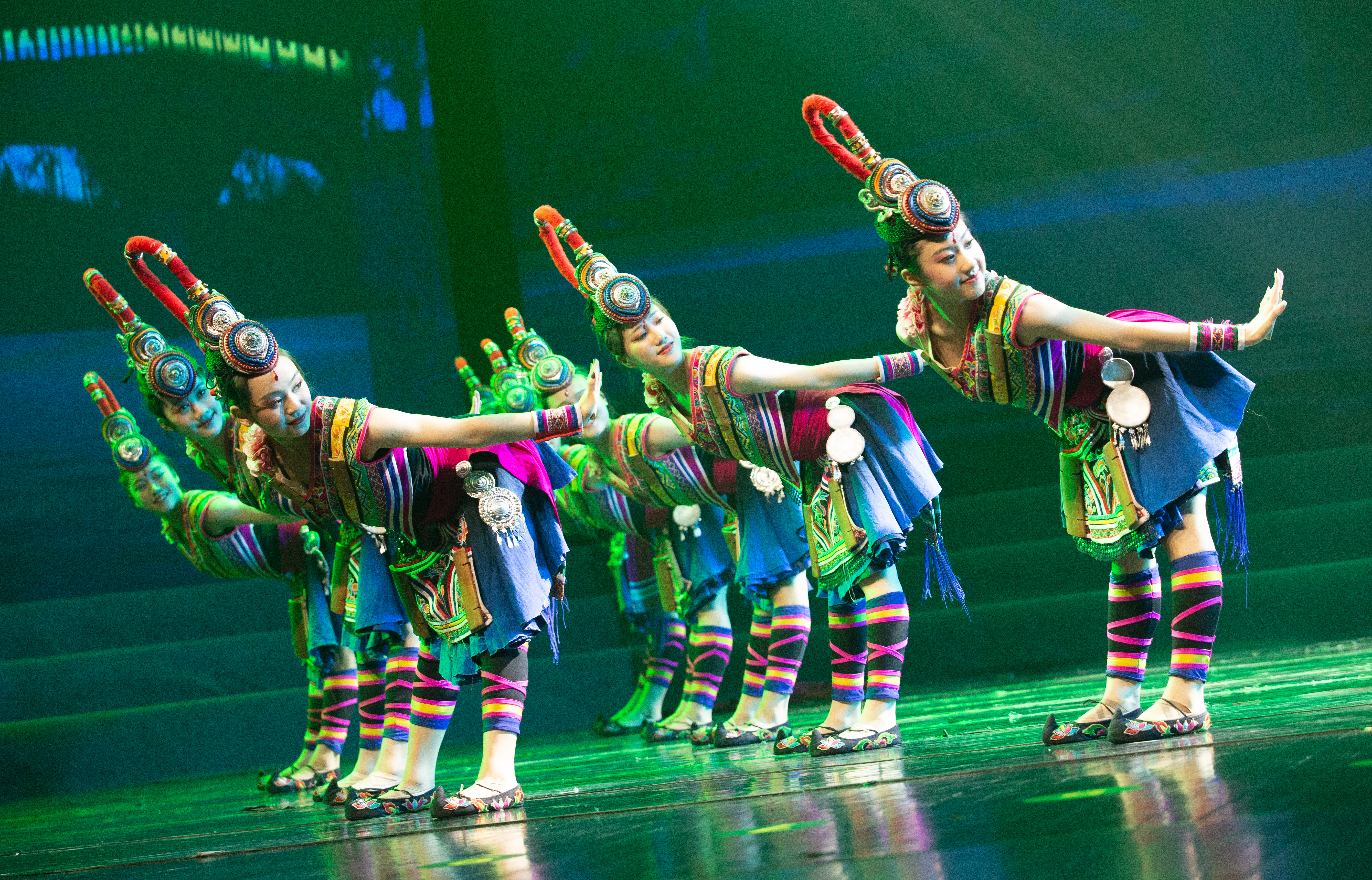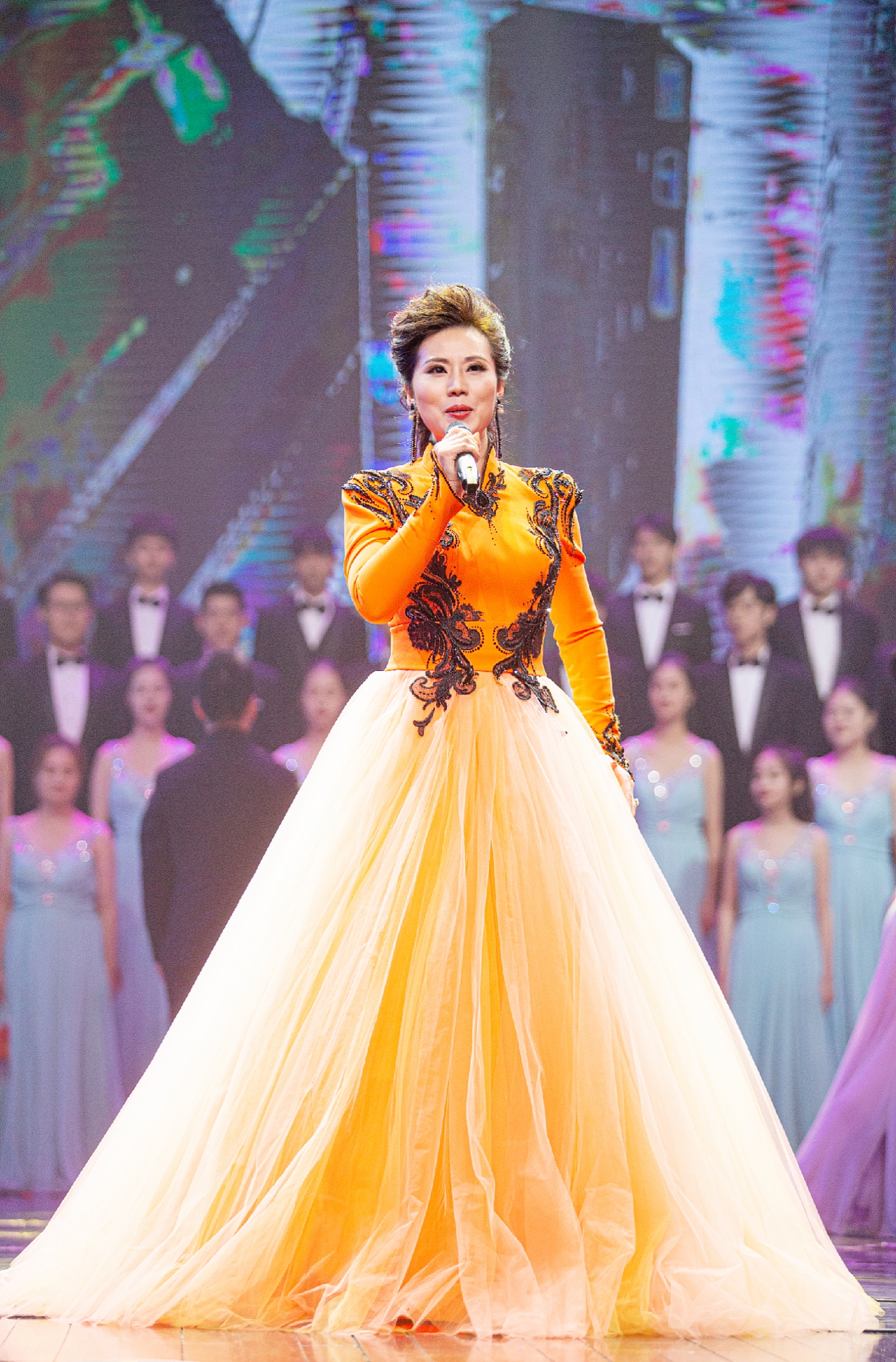 朱卓凡、沈贝贝男女声二重唱《不忘初心》,“向往你的向往,幸福你的幸福”,深情表达了对祖国的爱和祝福。韩紫娟、李猛等歌曲联唱《我爱你中国》《天耀中华》、丁倩文等女声四重唱《问春》,悠扬的歌声献上了对祖国在前进道路上再创辉煌的美好祝愿。音乐系陈利宏等师生联合演奏的打击乐《新龙腾虎跃》,鼓声震撼,让观众血液沸腾。我校经典剧目、舞蹈系获得全国“桃李杯”舞蹈大赛一等奖的群舞《畲家女儿拍》节奏欢快,展现了别样的民族风情。歌唱家、浙艺实践部副主任陈芬芳演唱了《中国进入新时代》,用歌声弘扬社会主义主旋律,展现了中国在未来道路的美好前景。