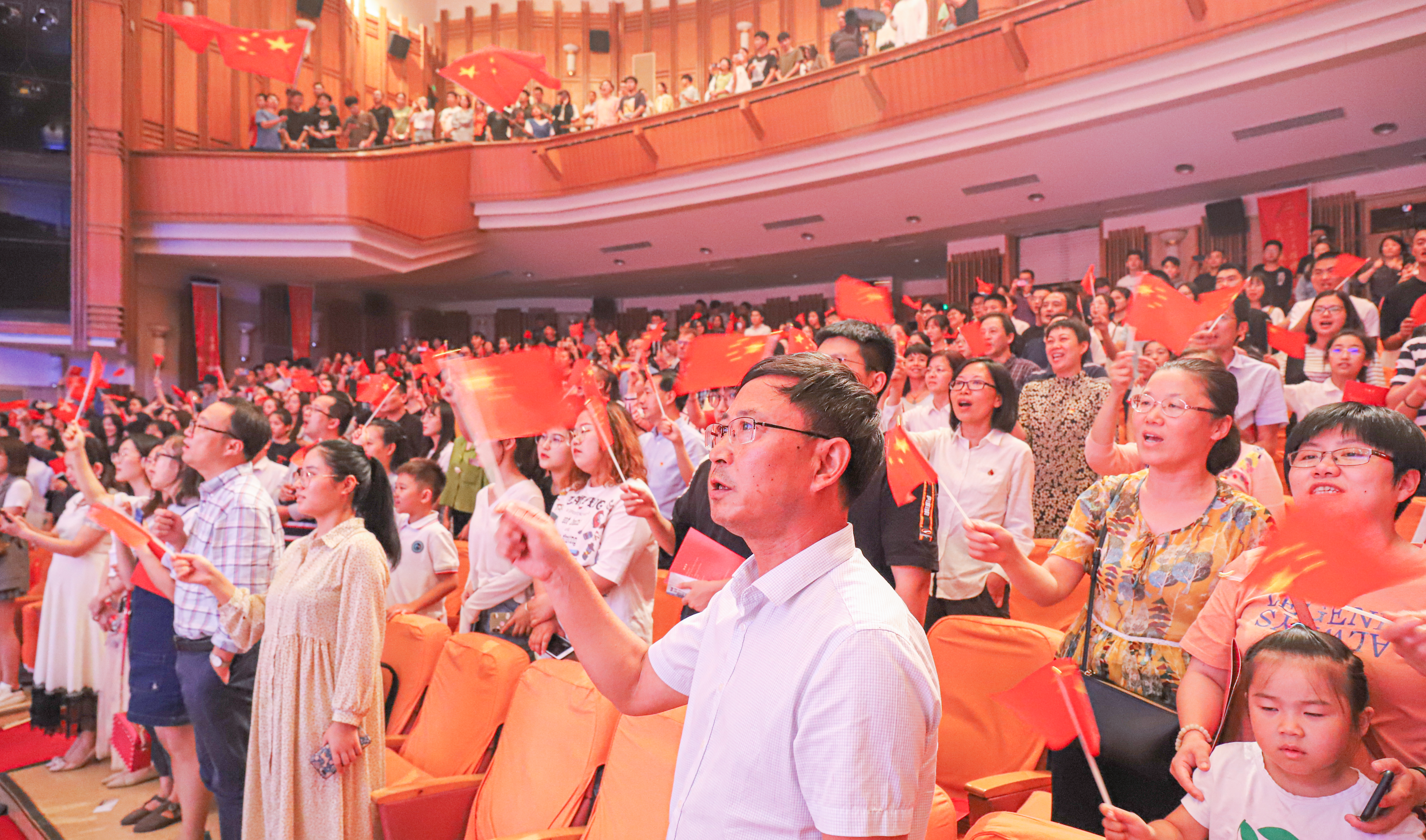 台上演员和观众全体合唱了《歌唱祖国》,国旗挥起来,歌声响彻剧场内外,共同祝祖国生日快乐,祝福祖国越来越好。