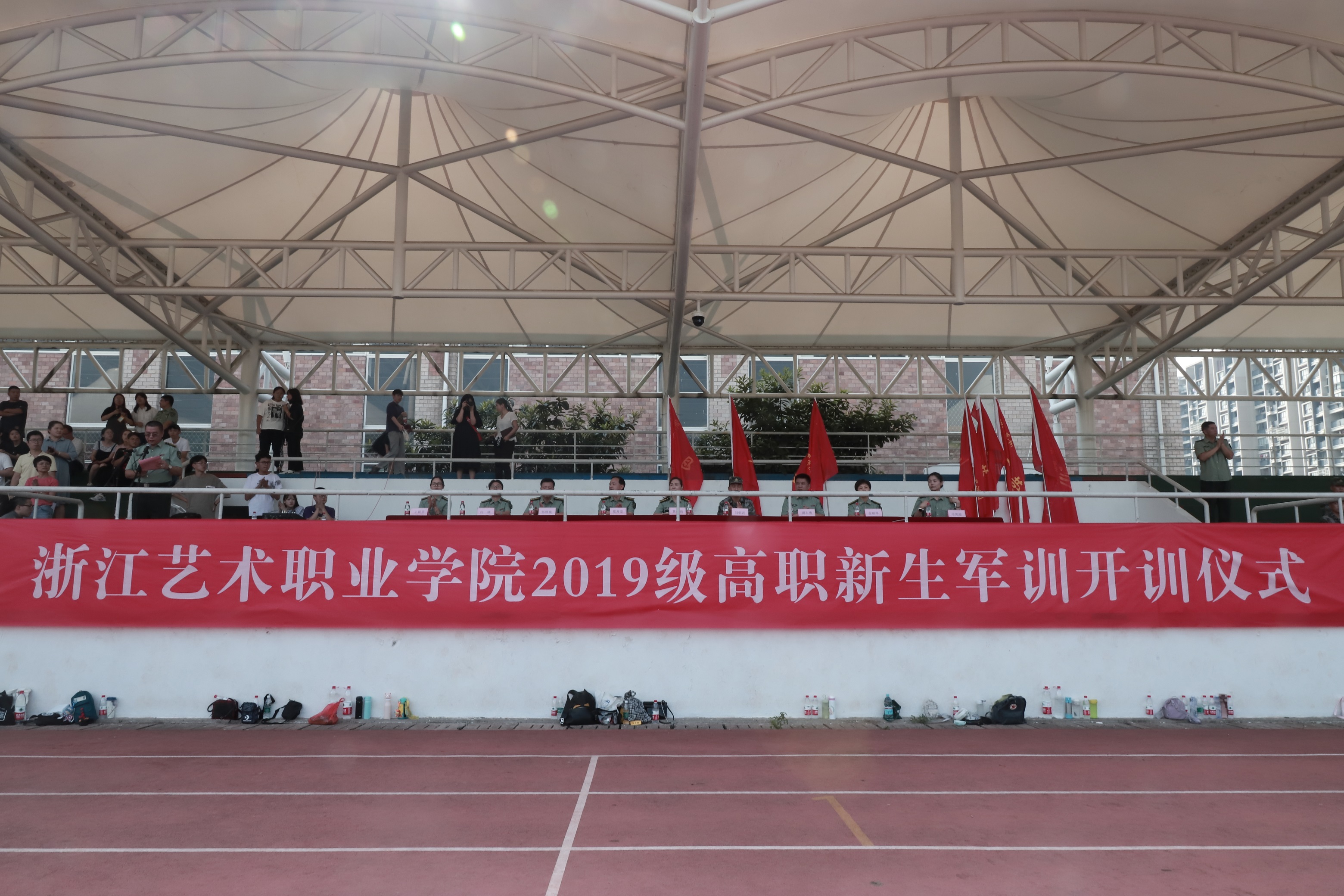 9月9日下午,浙艺2019级高职新生军训开训仪式在学校操场举行。中国人民解放军某部队电子对抗营副营长刘朝武、浙艺院长黄杭娟、党委副书记夏开堂、各系党总支书记以及各系辅导员和班主任参加。仪式由学工部(主持工作)副部长陈毅主持。