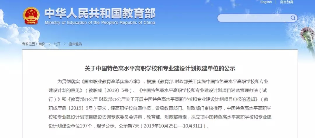 本次“中国特色高水平高职学校和专业建设计划建设单位”(以下简称“双高”)评选,经高职学校自愿申报,省级教育部门、财政部门审核推荐,中国特色高水平高职学校和专业建设计划项目建设咨询专家委员会评审,教育部、财政部审定,拟立项中国特色高水平高职学校和专业建设计划建设单位197个,现正公示。公示期7天。