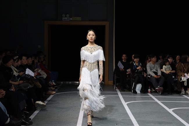 在礼服展示环节,穿着银色流苏裙的模特蜕变成华裳美人款款走来。在金色、白色流苏裙后,是典雅的婚纱,几位穿西装的男模,给这场秀增添了阳刚之气。