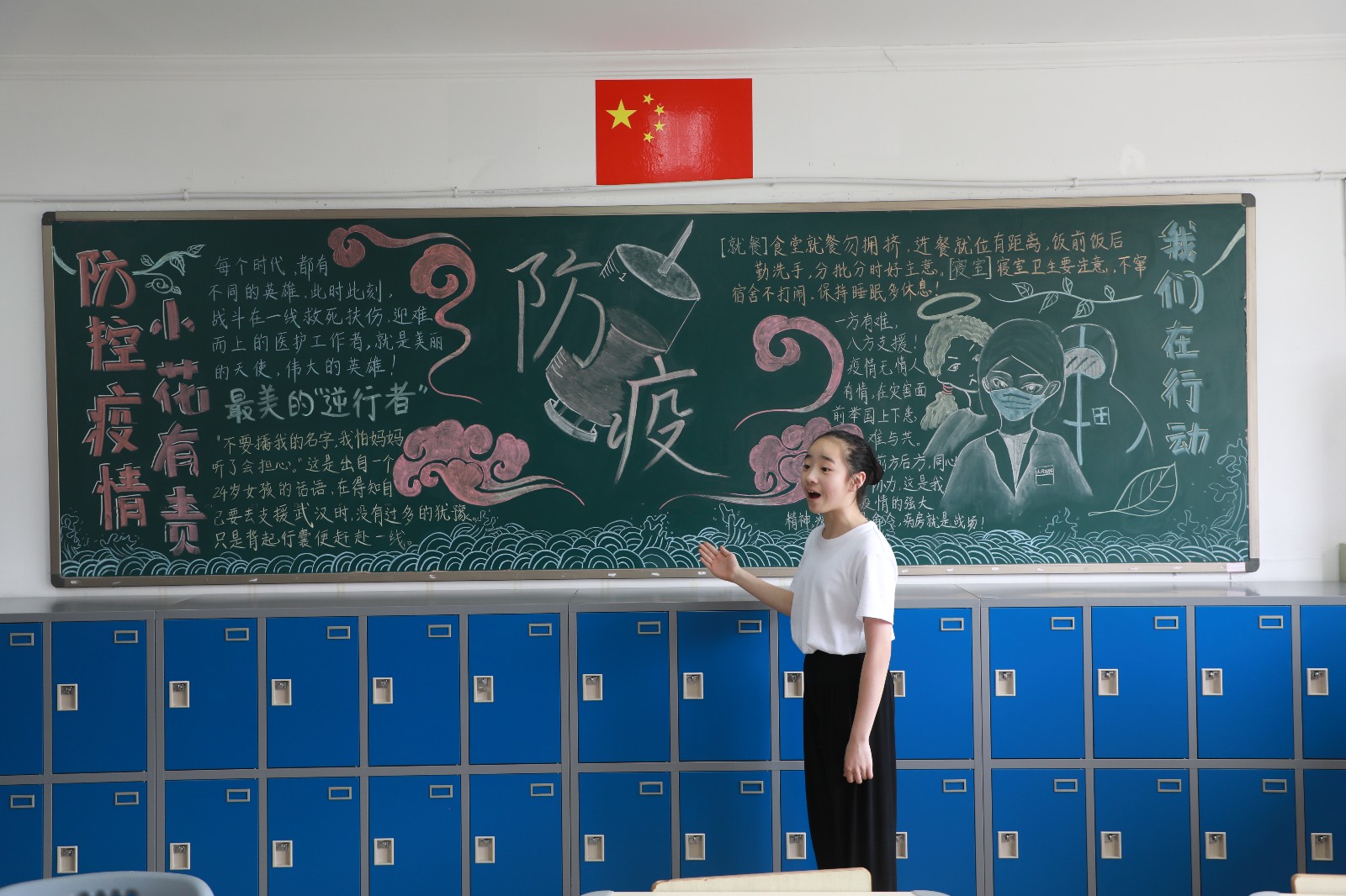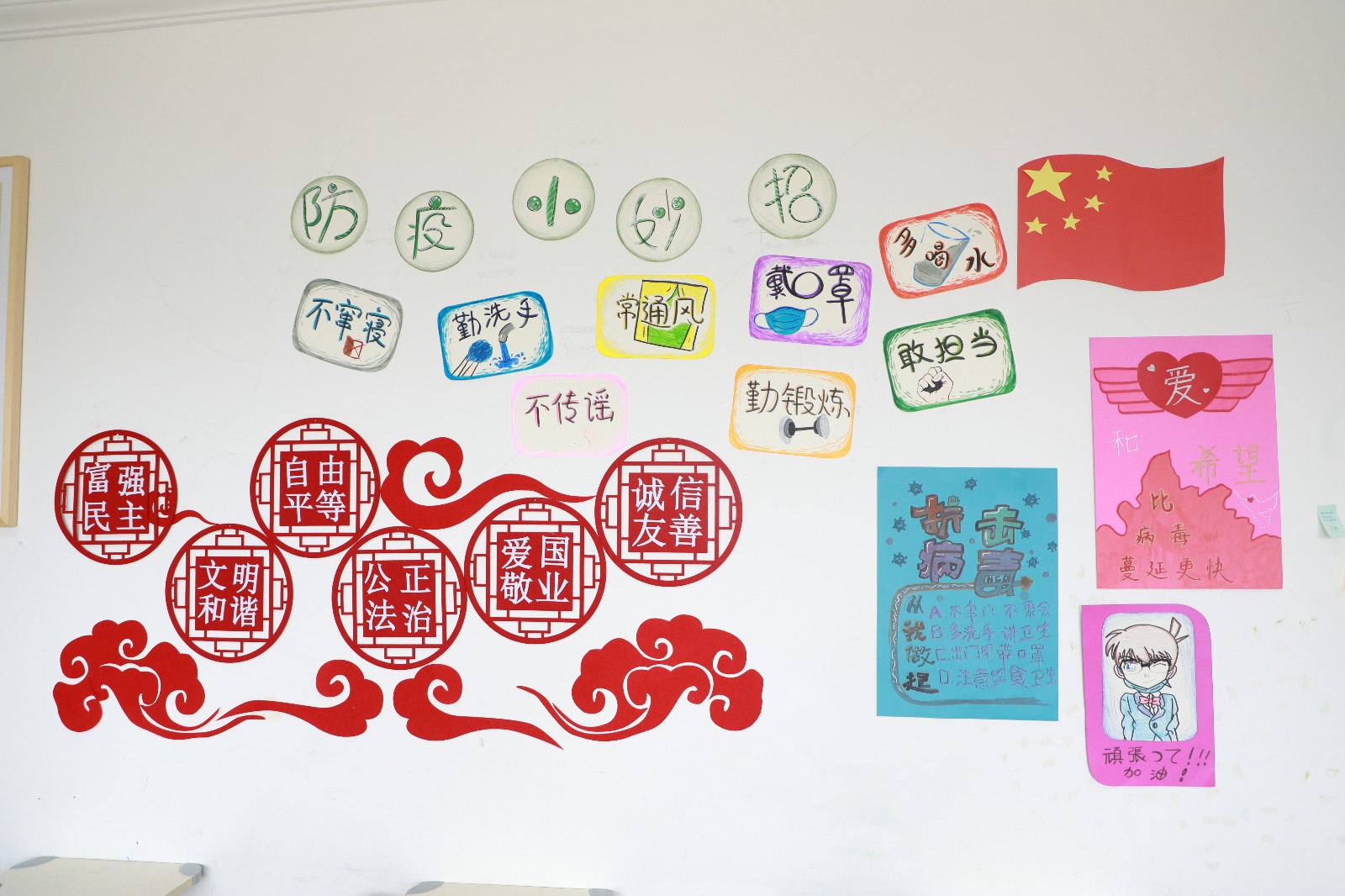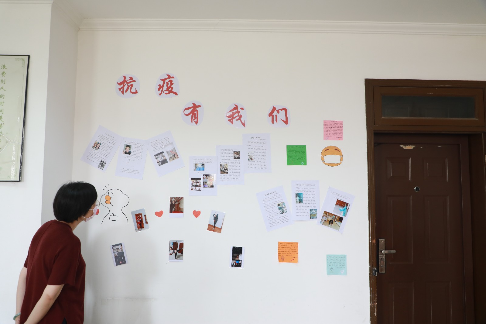 在墙面美化中,同学们发挥奇思妙想,把教室墙面装饰得丰富多彩。手绘抗疫海报、班级防疫流程图和预防新冠病毒知识宣传板,琳琅满目,还有的班级在墙上做了一个角落,名为“我们都是收信人”,上面贴满了同学们读了习总书记给北京大学援鄂医疗队全体“90后”党员的回信之后的感悟。