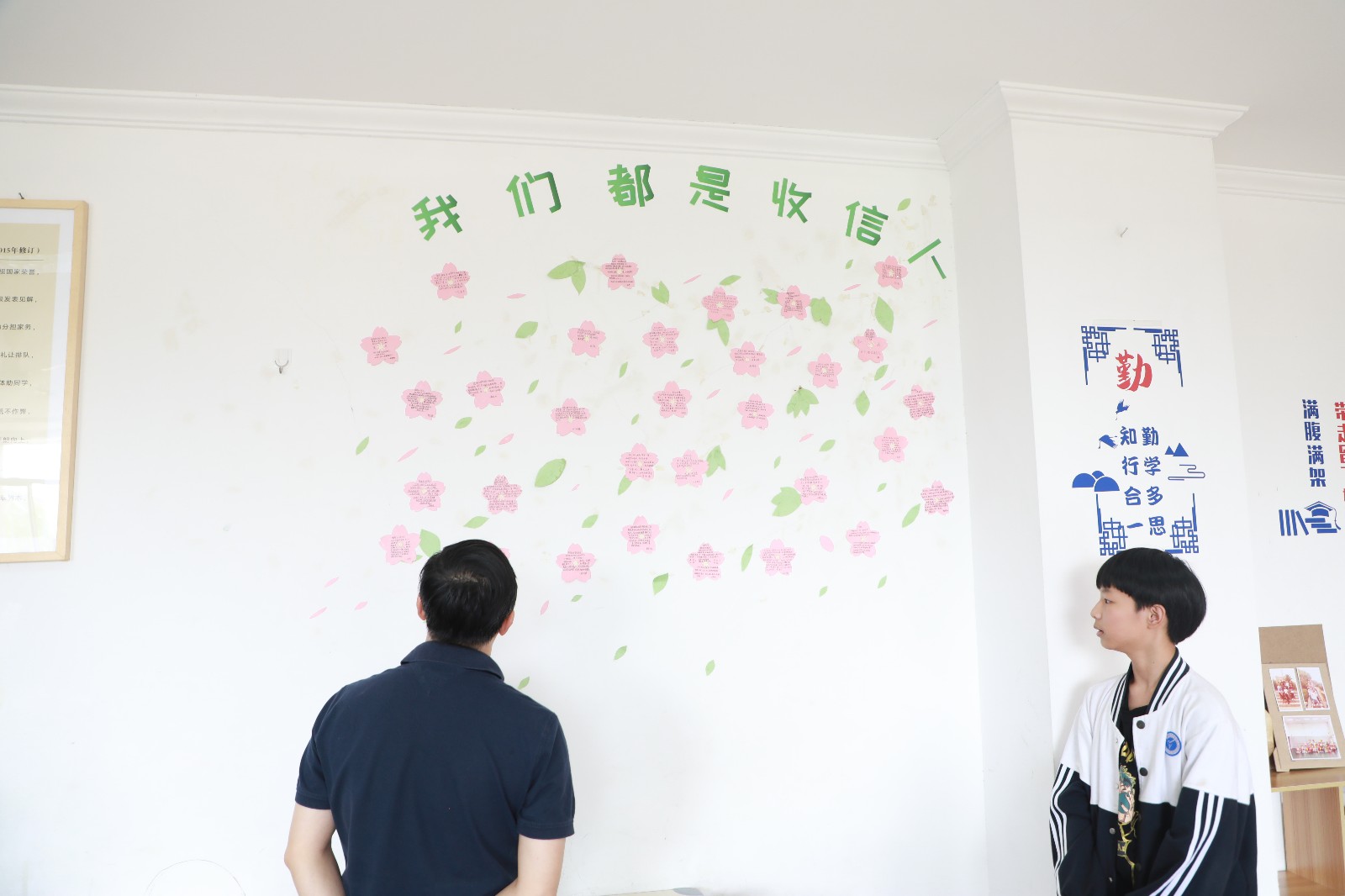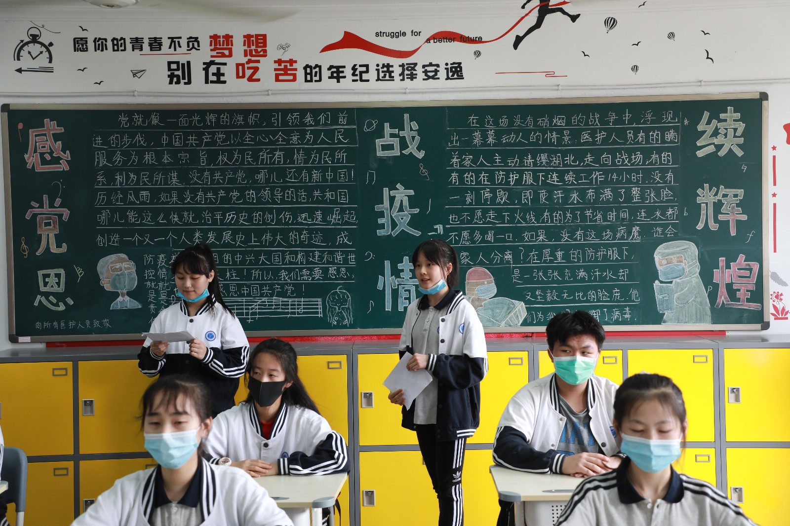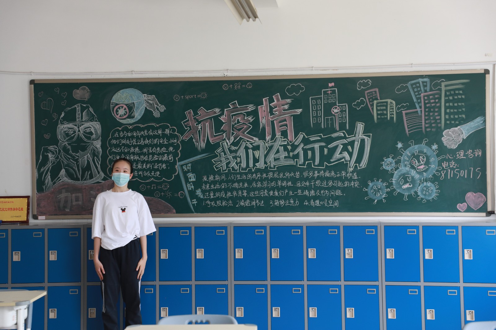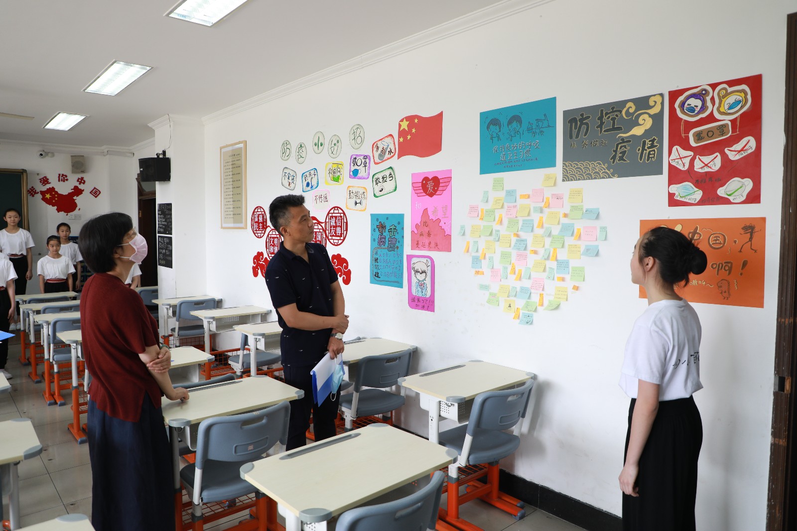 在墙面美化中,同学们发挥奇思妙想,把教室墙面装饰得丰富多彩。手绘抗疫海报、班级防疫流程图和预防新冠病毒知识宣传板,琳琅满目,还有的班级在墙上做了一个角落,名为“我们都是收信人”,上面贴满了同学们读了习总书记给北京大学援鄂医疗队全体“90后”党员的回信之后的感悟。