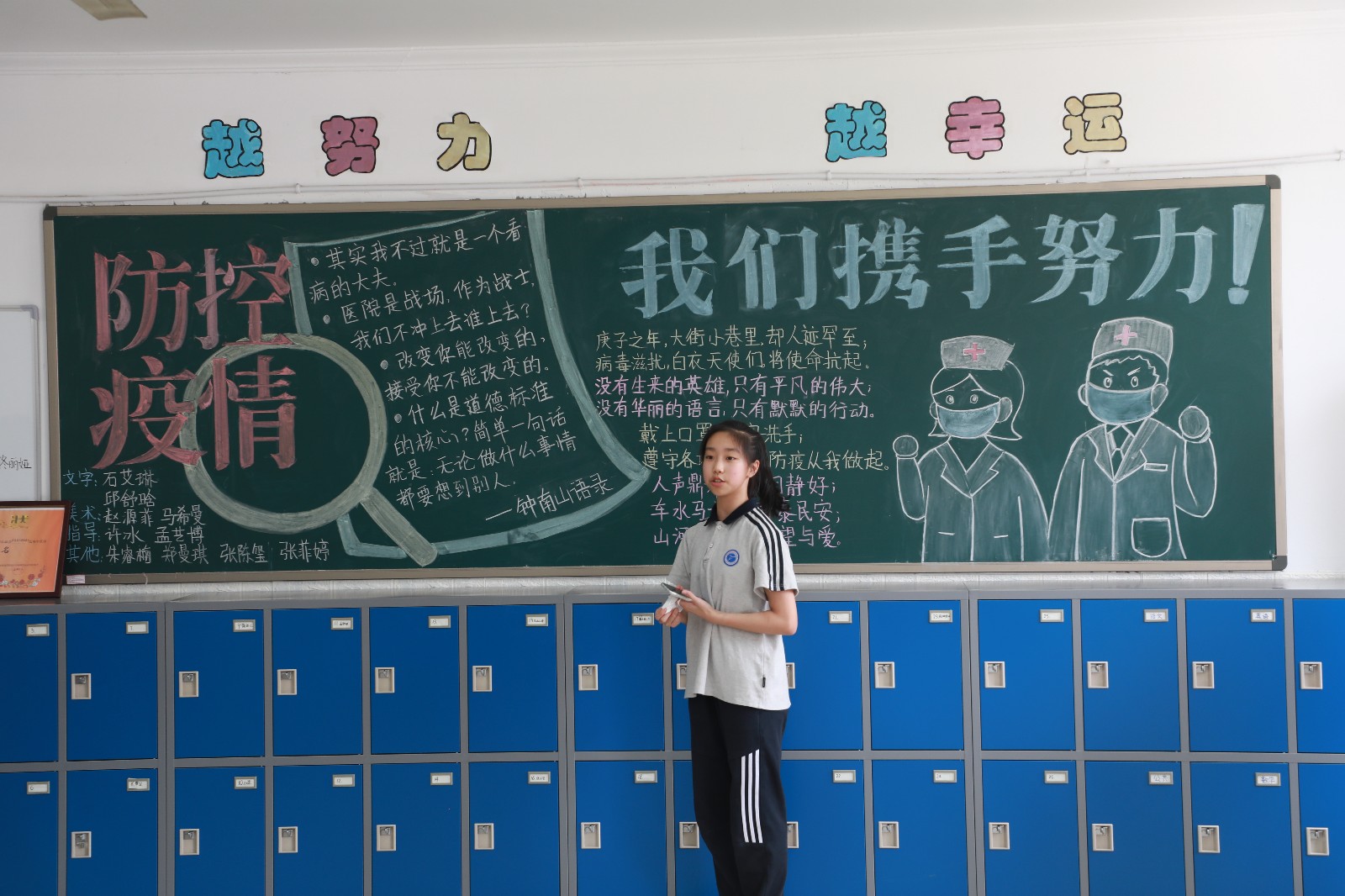 各班级结合疫情,以图文并茂的形式展现最美逆行者抗击疫情的先进事迹,内容丰富,板书书写工整,绘画生动形象。有黑板报分成感党恩、战疫情、续辉煌三部分,表达了同学们只争朝夕、不负韶华、走出精彩、成就辉煌的决心。有用祥云等代表性造型表达了作为龙的传人,防控疫情,人人有责。也有的班级以身披国旗的最美逆行者形象展开,画了武汉黄鹤楼相呼应,板报底部还画了戏曲人物像,表达了作为戏曲人以艺抗疫的担当。同学们设计的板报中,有的内容介绍了防疫妙招、洗手七步法则、心理疏导的途径和联系方式,也有介绍了抗疫中的先进典型人物和感人事迹,还有展现学生在家上网课和复课后教师的教学风采。