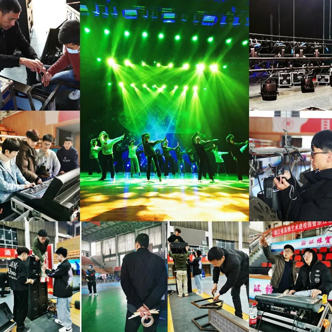 舞台艺术是一门综合艺术,优秀节目必须要通过舞美技术保障,才能更加焕发光彩。每次进入大学校园,舞美老师们早作准备,上下合力,因地制宜。结合高校演出场地,艺术场馆,器材设施,舞台、音响、灯光等设备的实际状态,将其调整至专业艺术院团演出标准,确保呈现最佳舞台效果。老师们角色也不时切换,至于搬运,安拆装等体力活那也是不畏劳苦,撸起袖子埋头苦干。装置老师是胶带纸不离手,清理主副台,舞台定位,置景等工作那可是信手捻来。灯光、音响、化妆、服装老师们也都各司其职,一丝不苟。在他们手把手的指导下,舞美专业学生承担起舞台监督、灯光操作、音响操作、摄像等工作,将理论知识用于现实工作,在实践中求真知获成长,为将来进入社会夯实技术基础。
