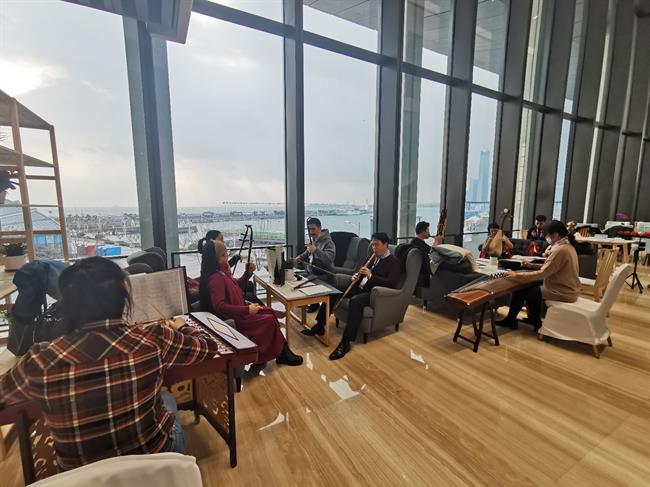 我校音乐系“江南丝竹音乐演奏团”创建于2015年,由音乐系师生组成,乐团以传承和创新江南丝竹音乐为宗旨,曾获得第一、二届“中国民族器乐民间乐种组合展演”最高展演奖等多项殊荣。此次在我校音乐系主任、中国艺术职业教育学会音乐专业委员会副主任、竹笛演奏家吴樟华带领下,演奏团师生在青岛艺博会充分展示了江南丝竹音乐。在沈诚邀请下,乐团为他伴奏了板胡曲《月牙五更》。演出结束后青岛媒体和观众评价:“虽然展演的节目只有三个,但风格从南到北,有浓郁民族风情的小提琴曲,有沁人心脾的江南丝竹音乐古韵悠扬,还有带着东北黑土地质朴、粗犷、爽朗和奔放的板胡曲。高质量的演奏难得一见。”