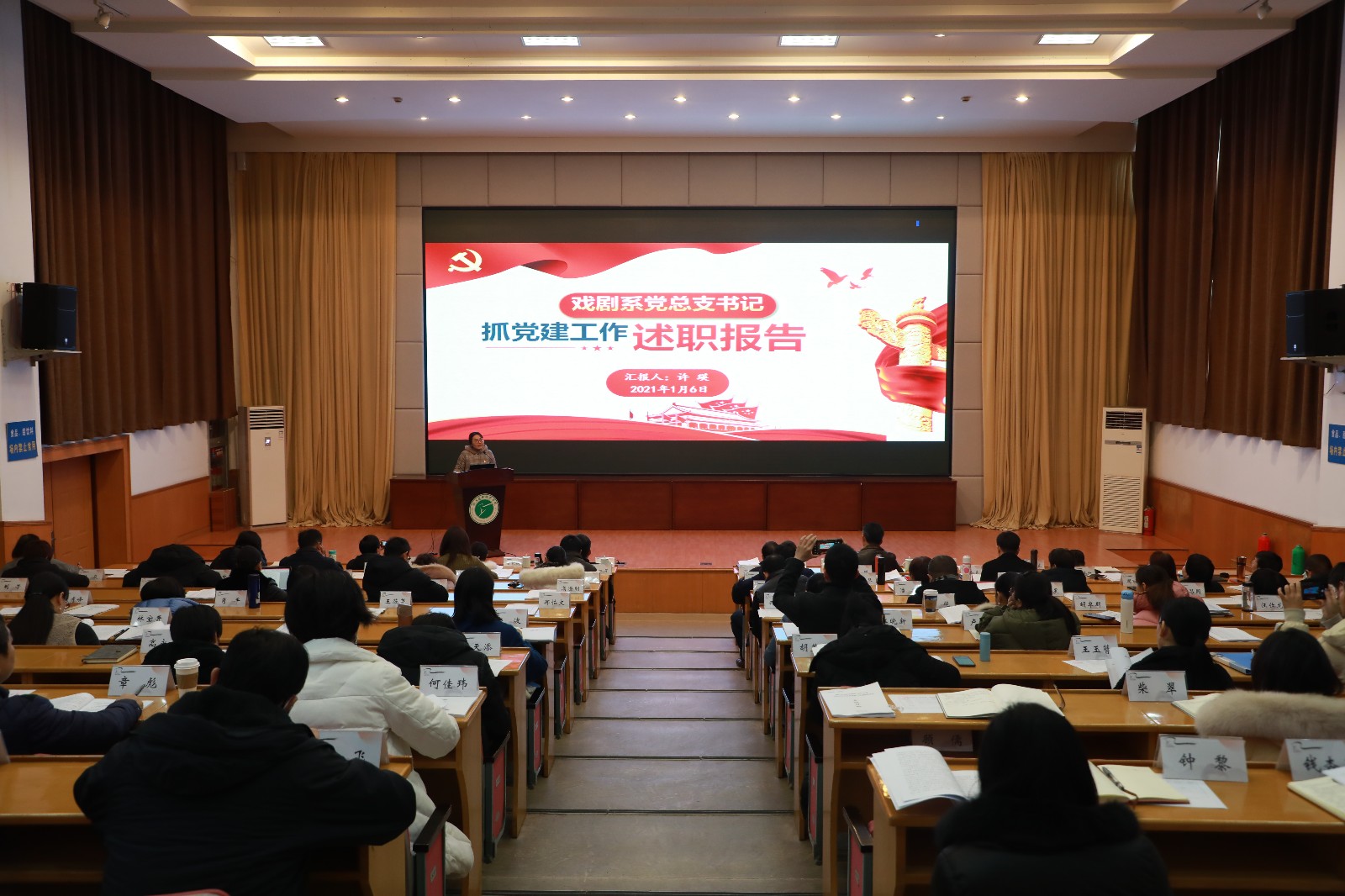 1月6日下午,浙江艺术职业学院2020年度二级党组织书记抓党建工作述职评议会在学校图信报告厅举行。校党委书记薛亮,院长、党委副书记黄杭娟等党委班子成员出席,相关职能部门和教学单位党政负责人、各基层党支部书记和教师代表等100余人参加述职评议会议。全校13个二级党组织书记围绕政治统领、思想引领、基层建设、服务大局、正风肃纪、责任落实、党建品牌等七个方面进行述职,其中7个教学院系党总支书记在书面述职的基础上进行现场述职,其他6个二级党组织书记进行书面述职。与会人员综合现场述职以及平时了解的情况对各二级党组织书记抓党建工作进行了评议。述职评议会由校党委副书记夏开堂主持,薛亮对述职进行集中点评并作工作部署。