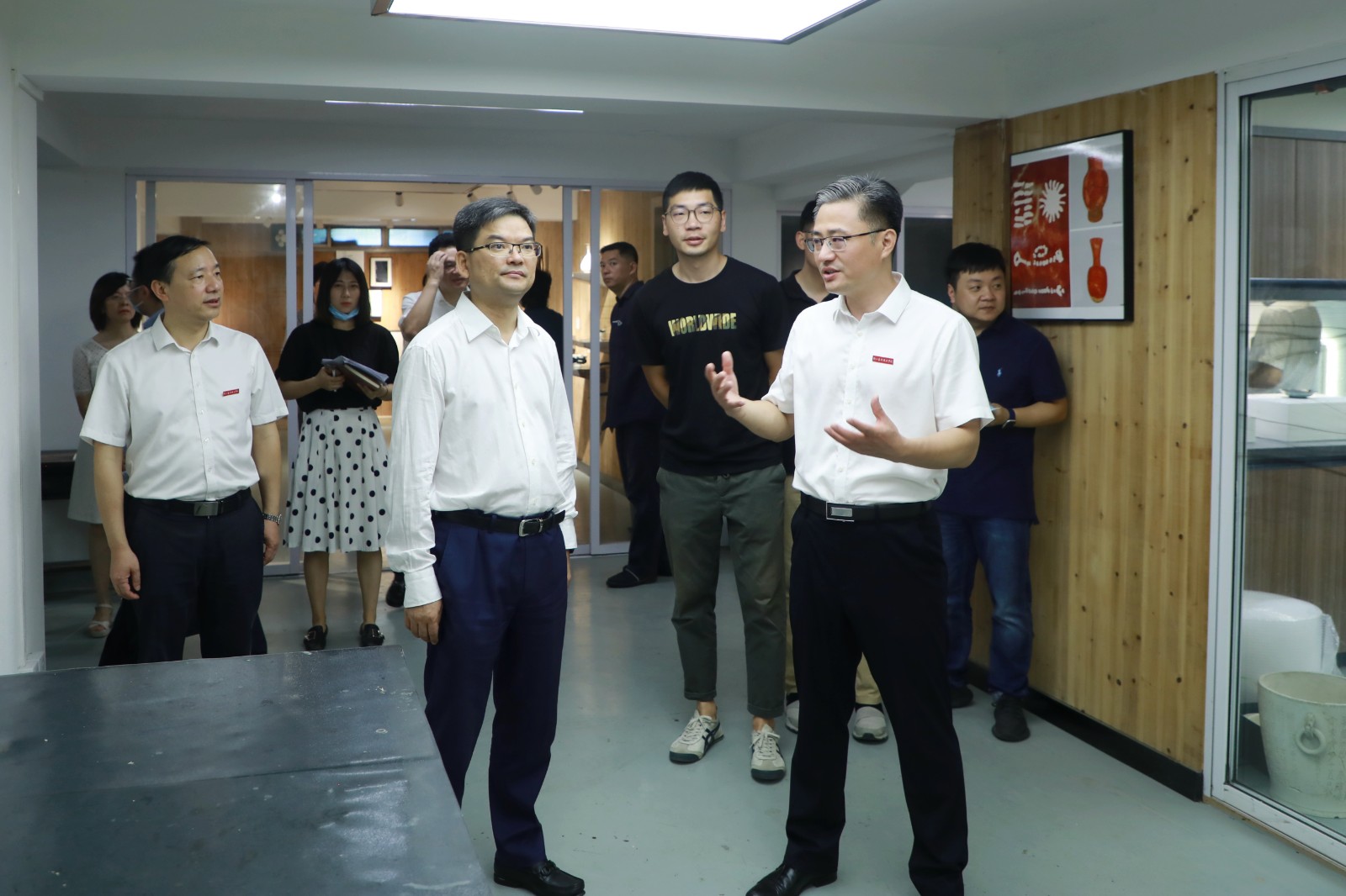 李志龙一行参观了国家“双高”专业群领衔专业戏曲表演专业教学场地、中央财政支持重点建设专业文物修复专业实训室等。在走访慰问中,李志龙向老师们送上了问候;在陶艺实训室,与我校文物修复与保护专业教师进行深入交流。他肯定了浙艺的教学水平和取得的教学成果,代表滨江区向我校全体教职工致以节日的问候,对学校的办学理念、人才培养、教育教学等方面给予了充分肯定。李志龙对学校为高新区(滨江)的发展建设所发挥的作用表示感谢,并希望学校能够继续发挥学科人才优势和社会服务功能,积极参与高新区(滨江)建设,推动全区教育事业发展再上新台阶。