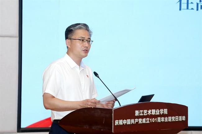为庆祝中国共产党成立101周年,回顾党的光辉历程,讴歌党的丰功伟绩,赓续红色血脉,浙江艺术职业学院在学校图信报告厅隆重举行庆祝中国共产党成立101周年主题党日活动。校党委班子成员,各党总支、直属党支部书记、副书记,全体中层干部、主管岗位人员,基层党支部书记、组织员和师生党员代表、学校“两优一先”受表彰对象、2022年发展的新党员代表参加活动。校党委书记薛亮作省十五次党代会精神宣讲,院长、党委副书记黄杭娟宣读表彰名单,校党委副书记夏开堂主持活动。