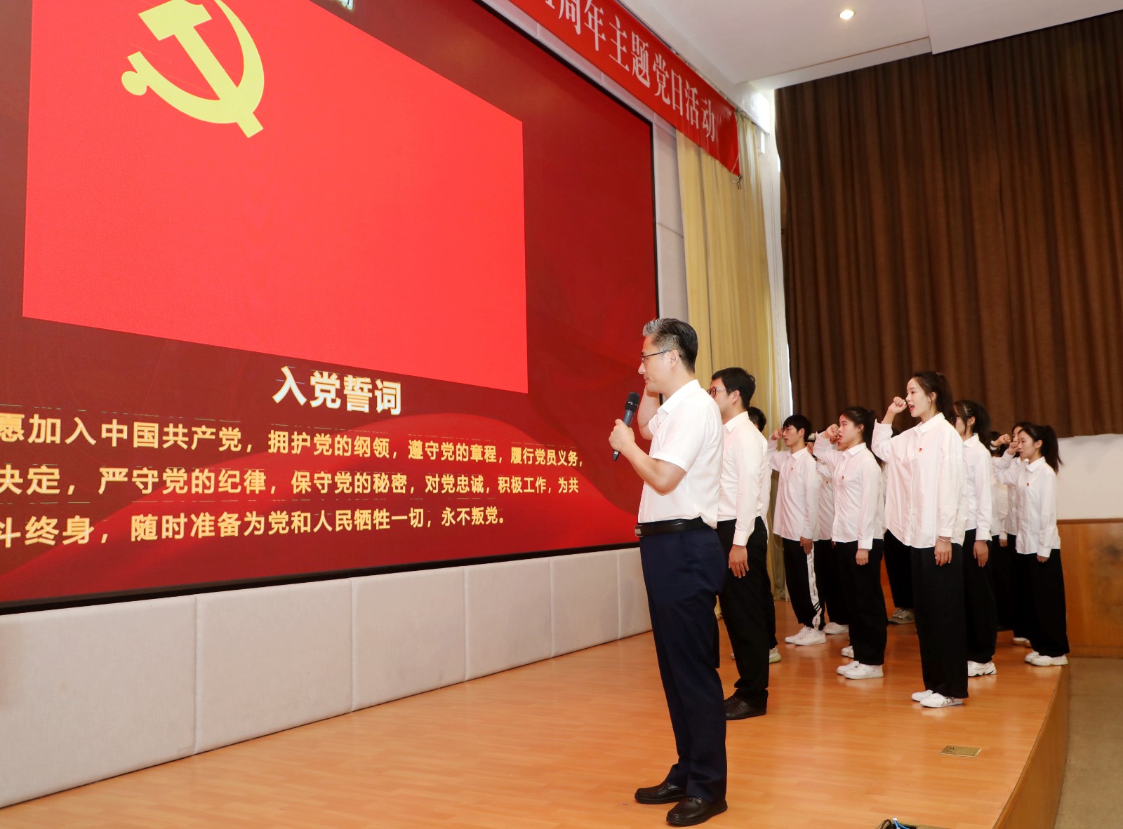 “我志愿加入中国共产党……”7月1日下午,校党委书记薛亮领誓,学校师生党员右手握拳,以炽热的感情面向党旗宣读入党誓词,向党作出庄严承诺。