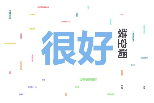 对学校进一步提高教学质量的建议。针对这一开放性问题,有300多名学生提出了建议,很多学生建议在琴房等实训场所安装空调,改善学习环境,还有学生提出增加公共任选课开课门数、增加实操性课程、增加食堂菜品等建议。学校将听取合理的宝贵建议,积极采取有效措施,坚持以学生为本,着力提高学生的学习满意度。