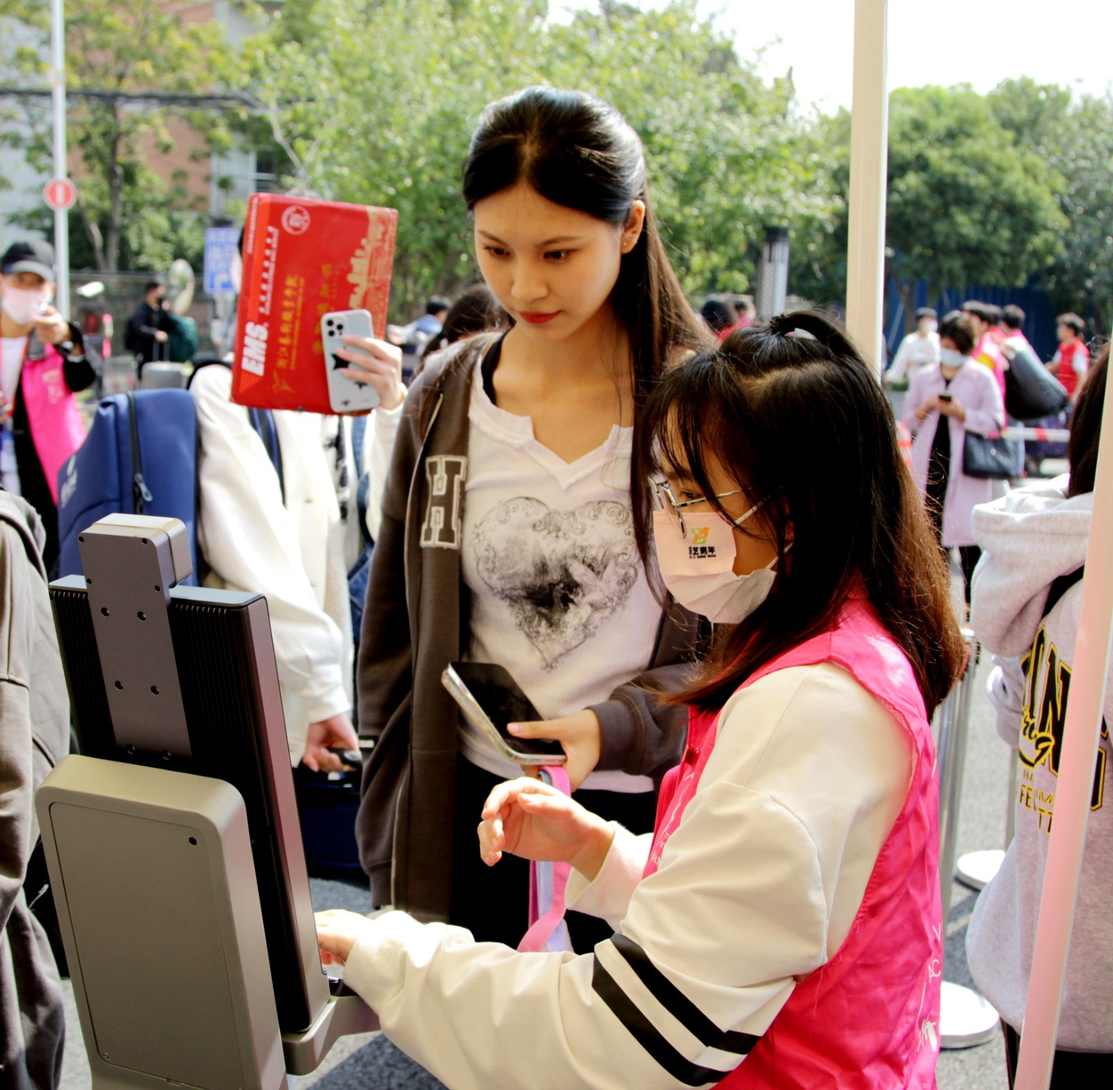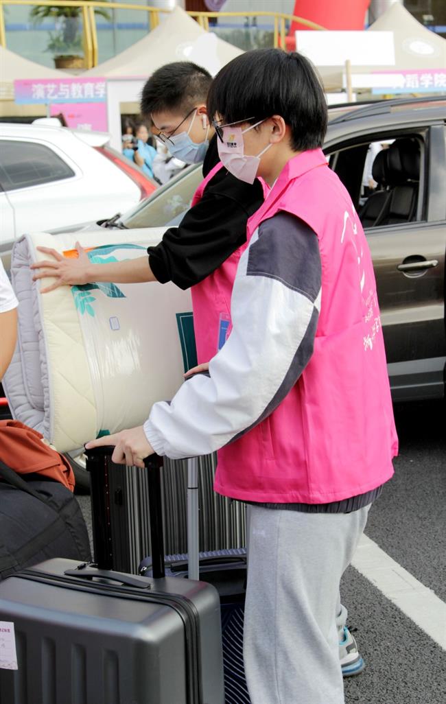 志愿者是报到现场的一道亮丽风景线,搬运行李,指引道路,扫码测温,为新生拍照,现场唱歌营造气氛,志愿者们不仅为新生提供全方位服务,而且多才多艺,让新生们开开心心报到。行李存放处、摆渡车旁随处可见志愿者的身影,志愿者的给力让报到工作有条不紊地进行。