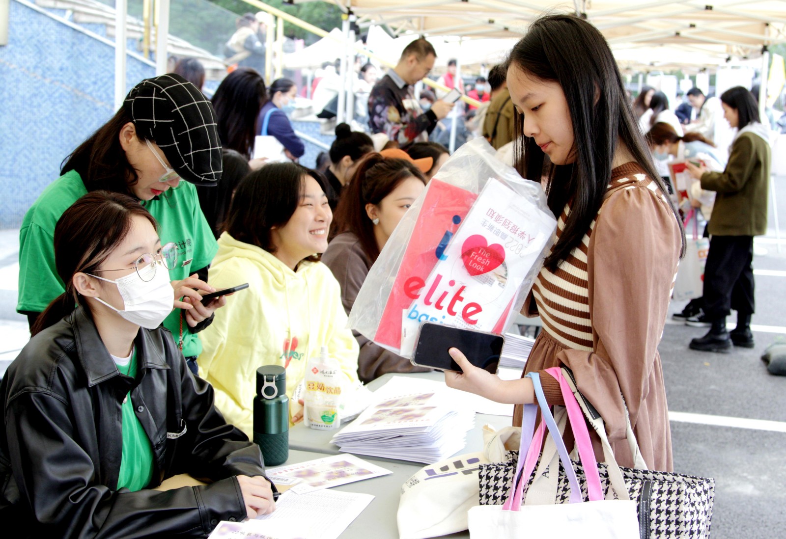 浙江实验艺术剧场广场上非常热闹,播放校歌、志愿者引导、搬运行李……报到气氛热烈。领取新生大礼包、验证录取通知书、户口办理、学平险办理……各二级学院都设置了报到点和行李寄存点,为新生提供相应服务。