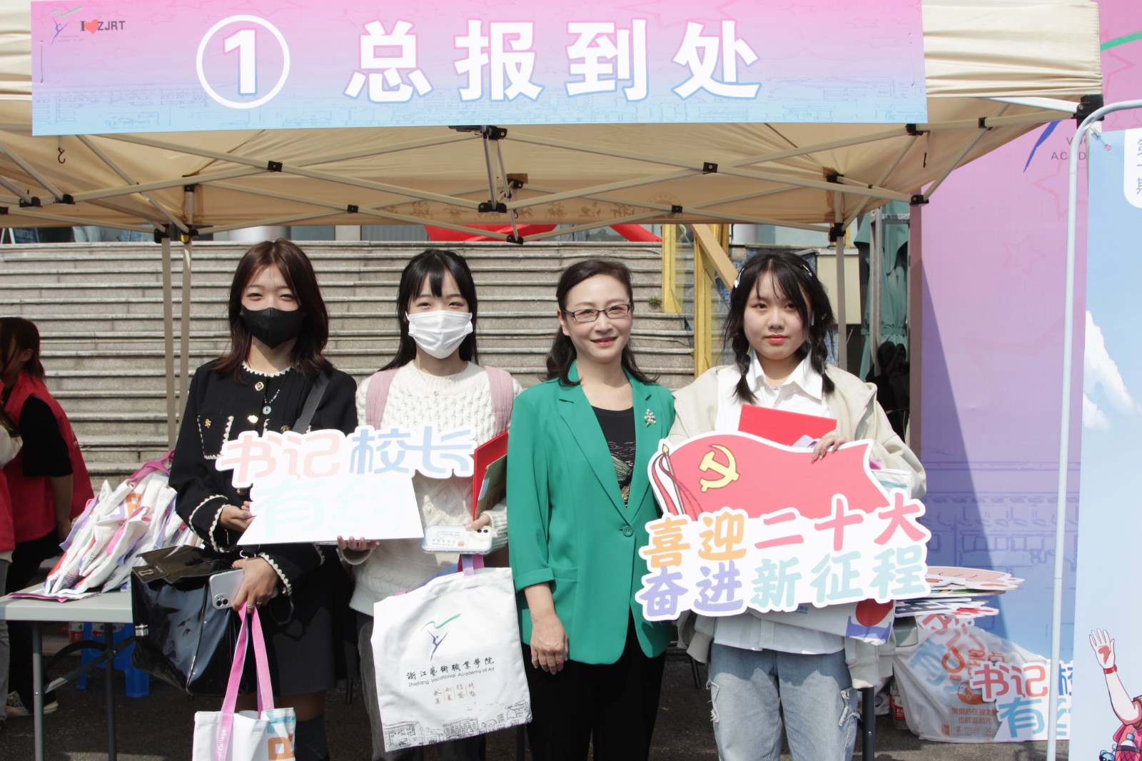 结合新生报到,学校举行第十期书记校长有约活动。浙艺党委书记薛亮,院长、党委副书记黄杭娟,党委副书记夏开堂,党委委员、副院长沈军甫来到报到现场,对工作人员表示慰问,为新生发放新生大礼包,为到来的新生送上祝福,加油鼓劲。
