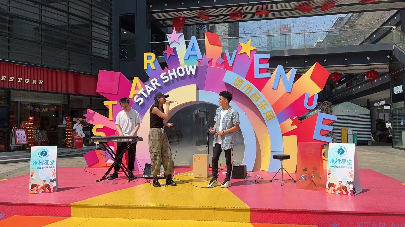 在星光大道电影文化艺术街区,音乐学院流行教研室、声乐教研室和街舞社共同打造的“流行星空”火热开演。或低吟浅唱,或高歌亮嗓,将激越、鲜活、多样的魅力展现在舞台上,用富有张力的音乐表现力和超强的现场感染力,带动全场观众的情绪。街舞表演节奏明快,富有动感,展示了浙艺社团的青春和朝气。