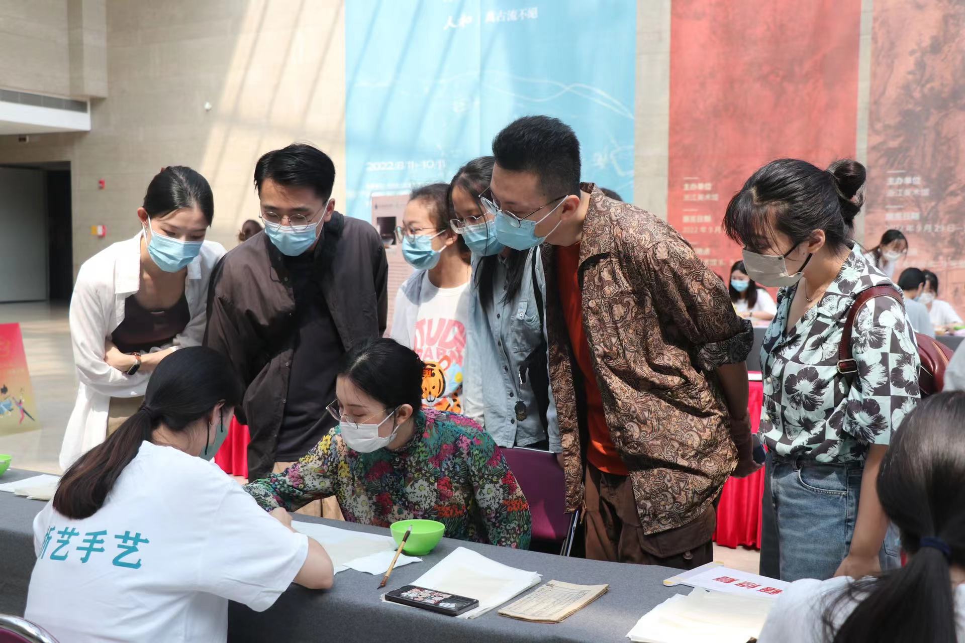 在浙江省美术馆,手工艺学院文物修复与保护专业师生将古籍修复技艺、古籍装帧技艺带入场馆,守护故纸文明,用手艺赋美文艺。“古籍装帧技艺”体验的线装书均由同学们手工装订,在现场手把手带领游客“穿针引线”。体验者络绎不绝,在一钉一针一线感受古纸风韵。“古籍修复技艺”用一把排刷、一碟浆糊、一个镊子延续古籍脉搏,经过配纸、加固、修复、压平、折页、修剪、装订等工序完成,用精心修复使破损古籍得以焕然一新。