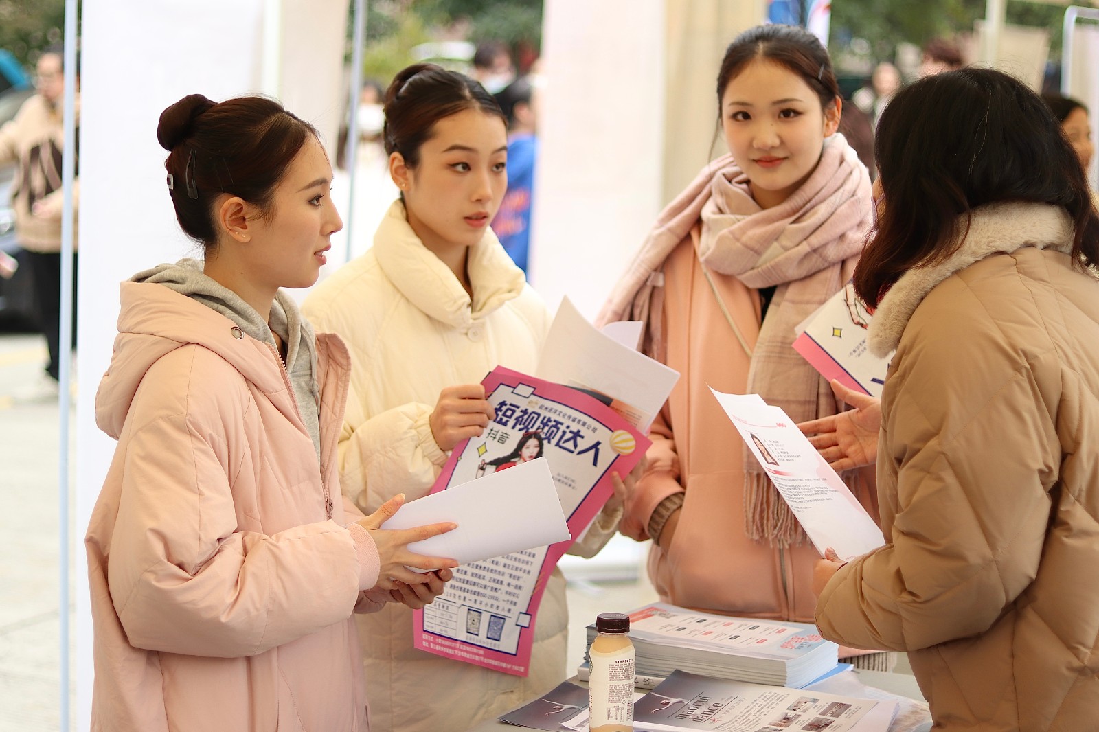 招聘会现场,2023届毕业生们着装整洁,手持简历,认真浏览招聘企业信息,寻找自己感兴趣的岗位,积极主动地与企业招聘人员沟通、交流,介绍自己的专业优势和岗位期待。