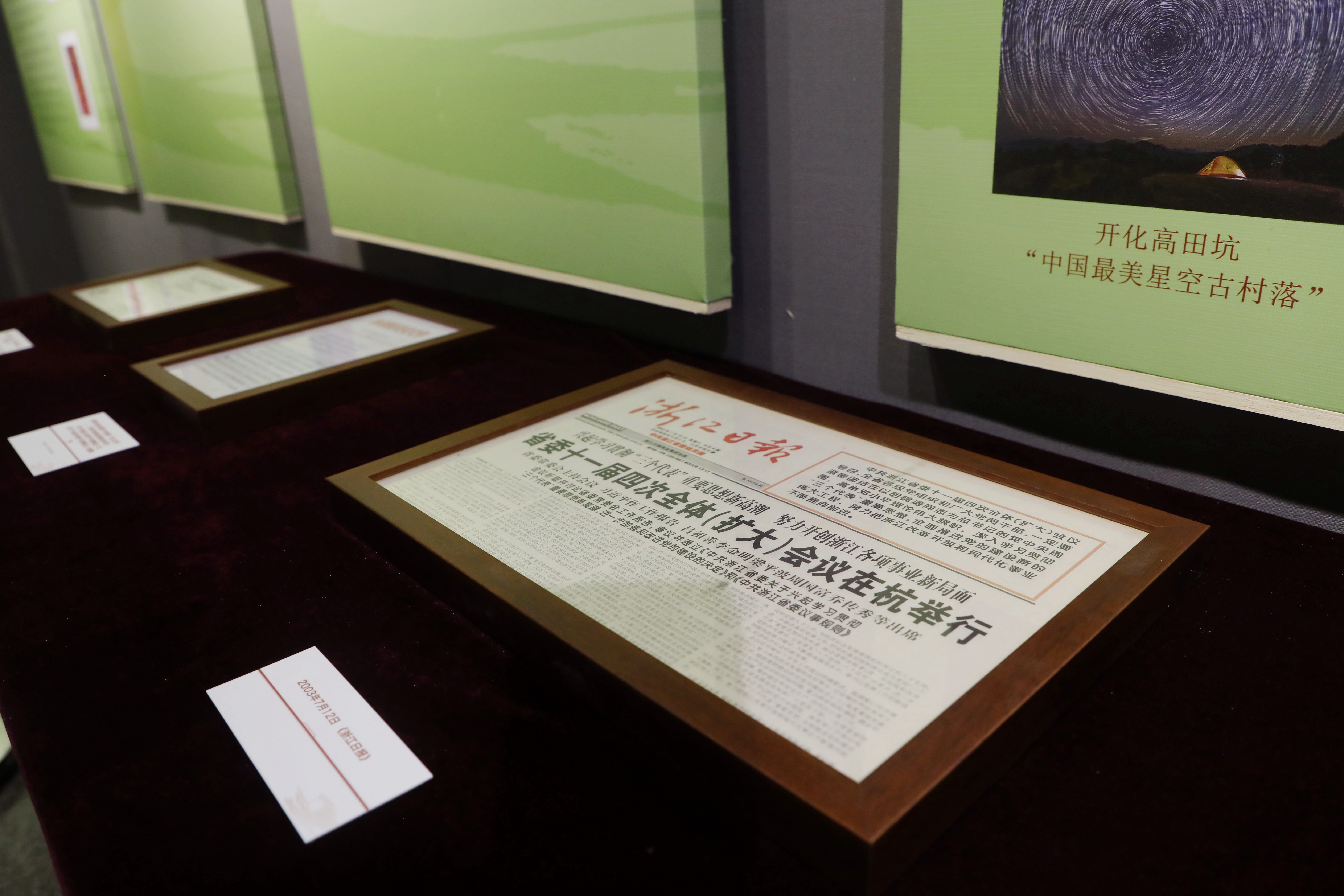 展览首先通过《浙江新潮》等革命文献文物,以“扬帆起航、冲破迷雾、劈波斩浪、红旗潮涌”为单元,阐述了中国共产党从初创至崛起的历史;同时回顾新中国成立后“政权在杭立宪”“恢复发展国民经济”“艰苦奋斗开拓创新”的史实,以“中美建交”“三大改造”等国际国内措施,体现浙江在重大决策面前的伟大实践;随后聚焦“实践检验真理标准、对内改革浙江经验、对外开放贸易强者、科教兴国产业集群”四个板块,陈列《人民日报》《解放日报》等革命文献史料,强有力地证明了浙江始终走在党中央重大决策第一线;最后着重“绿色发展美丽浙江”“文化赋能城乡一体”等新时代战略,以“五水共治”“打造文化精品”等多项落地工程展示浙江如何有力推动高质量发展。
