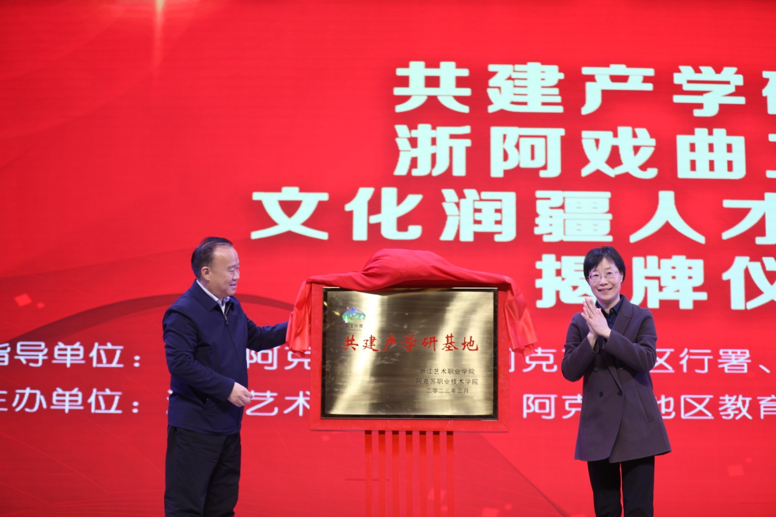 省文化和旅游厅党组成员、副厅长朱海闵,省援疆指挥部党委副书记、副指挥长王忠民,阿克苏地委委员、宣传部部长常玉轩出席浙阿艺术院校合作共建仪式,为共建产学研基地、文化润疆人才培养平台、浙阿戏曲工作坊分别揭牌,观摩“组团式”文化援疆成果汇报。