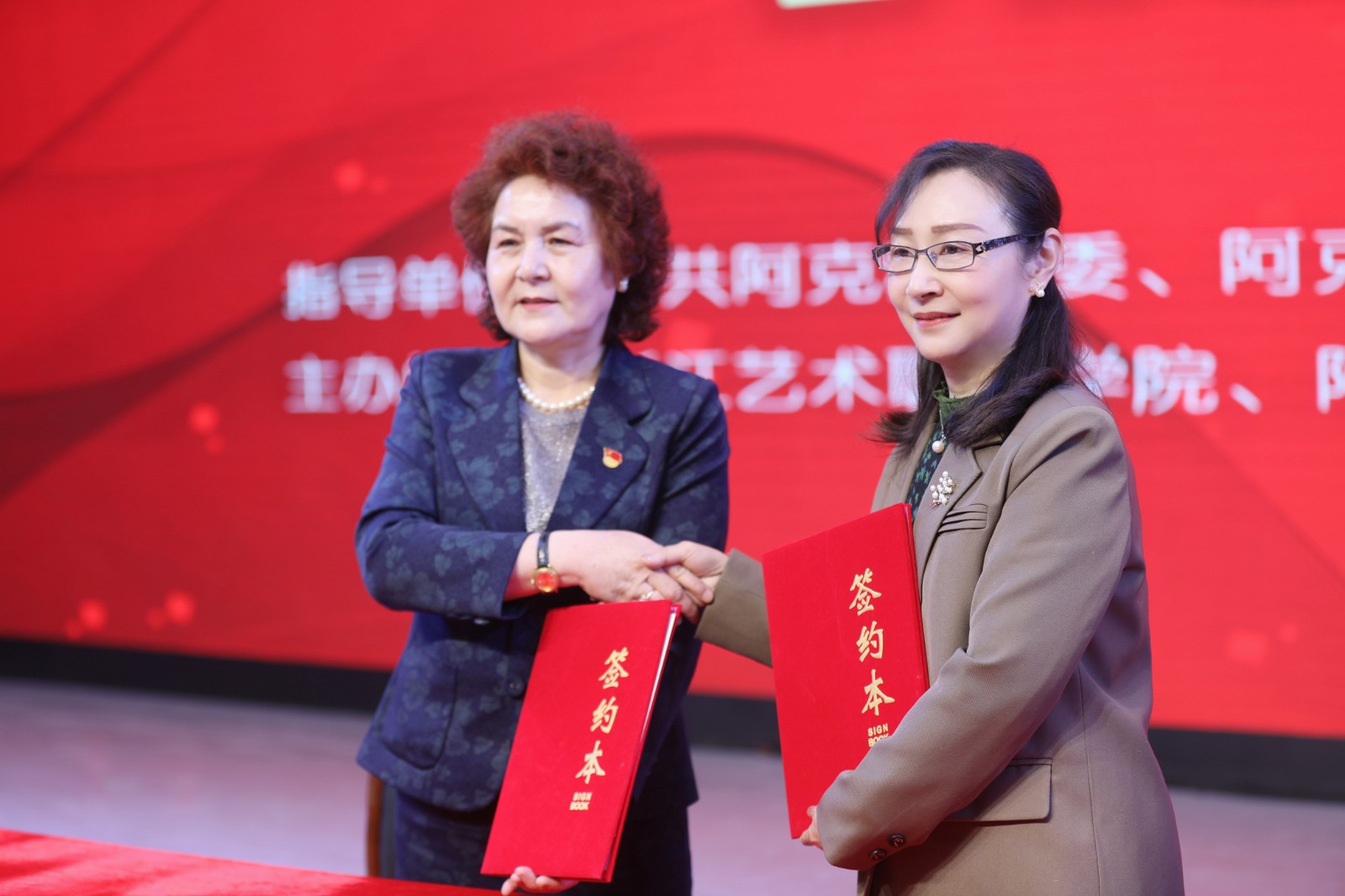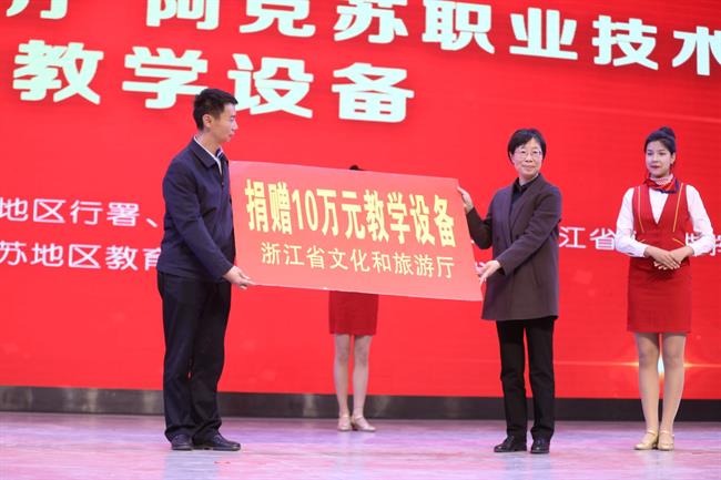 共建仪式由阿克苏职业技术学院党委书记蒲思雄主持,浙江艺术职业学院院长黄杭娟、阿克苏职业技术学院院长买尼沙木•亚生签订合作共建协议。双方秉承“多元共建、开放合作、优势互补、共同发展”的宗旨,充分发挥甲方专业优势、人才优势,深度聚焦乙方本土文化艺术专业教学特点,推动双方在文化艺术专业建设、师资培训、人才培养和产学研基地共建等方面开展合作。省文化和旅游厅向阿克苏地区捐赠教学设备。