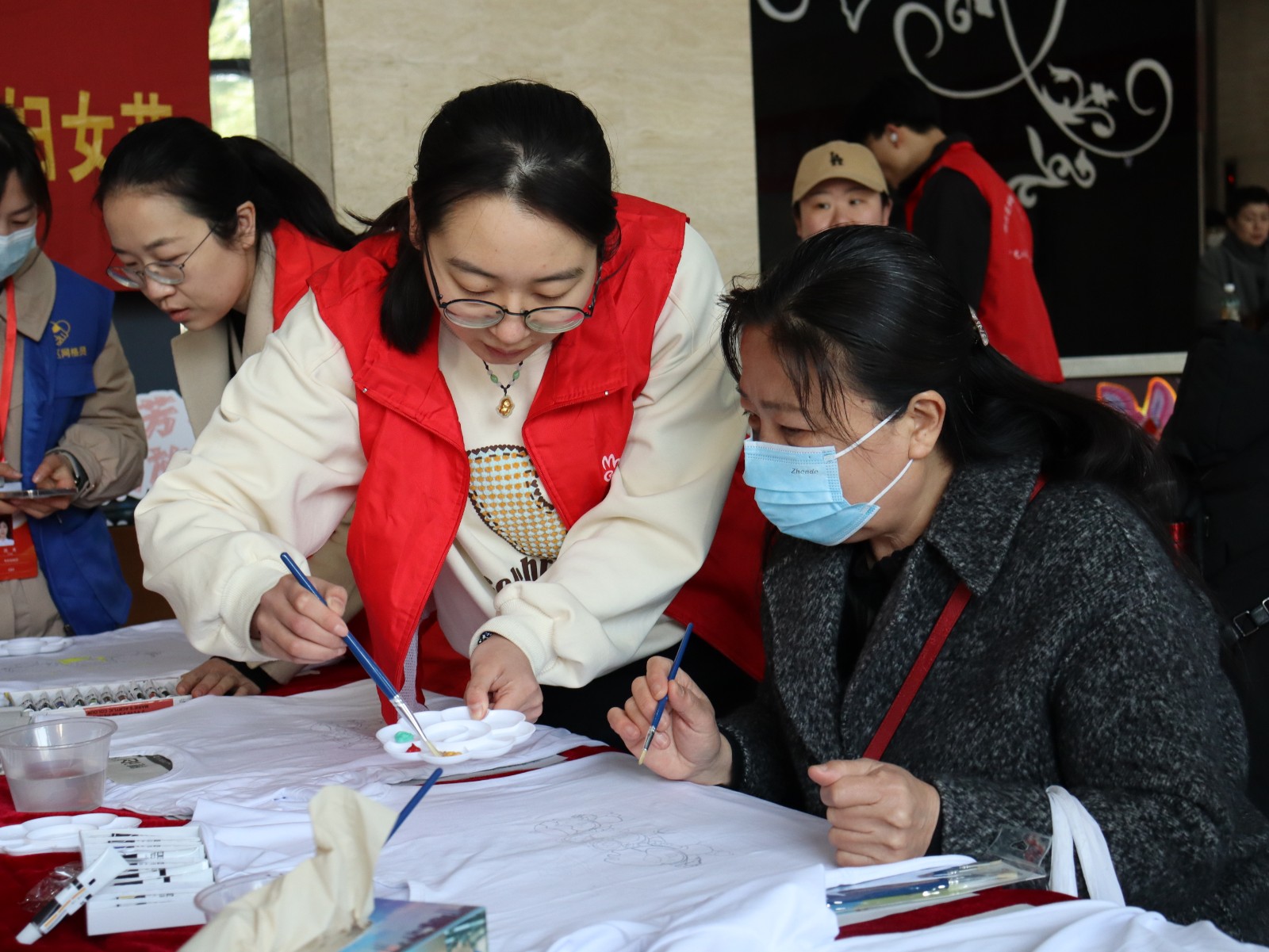 在“巾帼绘亚运”创意彩绘T恤活动中,外国友人们神情专注,精心在衣服上进行彩绘。
