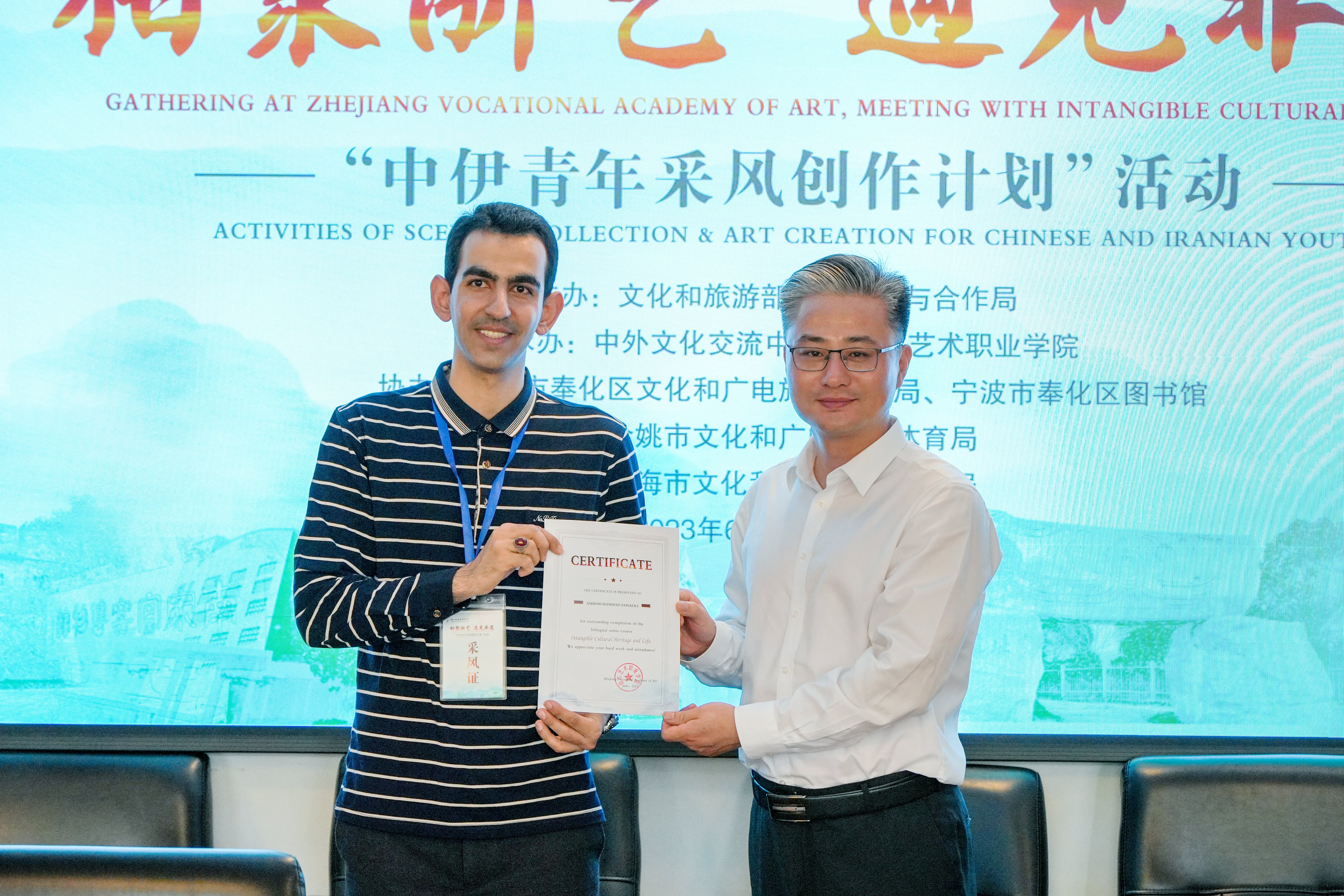 浙江艺术职业学院作为承办方,依托全国非遗传承人研究研习基地、省级非遗传承与研究基地、教育部“双师型”教师培养培训基地,积极筹备、广泛联络、精心策划非遗课程和活动方案,伊朗青年学者与浙江艺术职业学院师生一道,与地方文旅广电局一起,圆满完成了曲艺、非遗技艺的学习和课程输出。