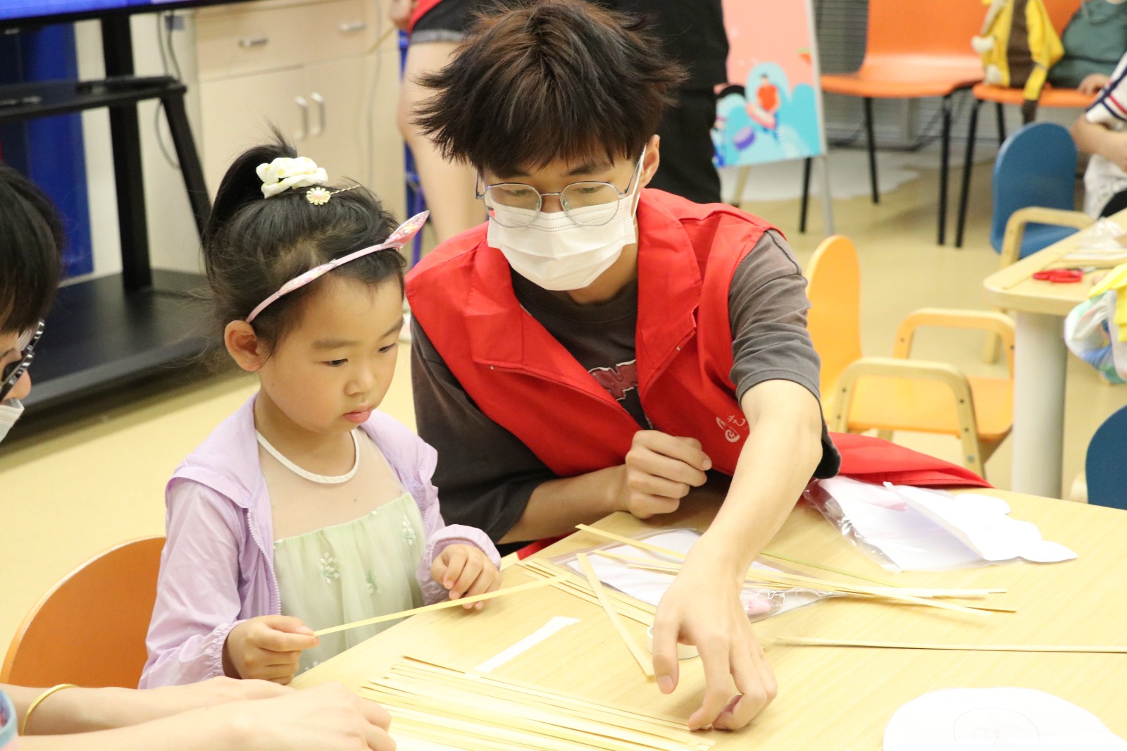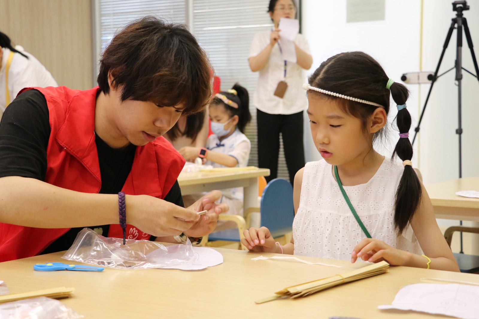 活动伊始,手工艺学院志愿者“艺小匠”将竹编的历史渊源娓娓道来,巧妙引导小朋友详细了解竹编的发展历程、传承意义及竹编工艺品种类,引领小朋友们穿越时间长河,感受作为国家级非物质文化遗产的竹编技艺所蕴含的东方智慧和独具匠心的巧思妙想。