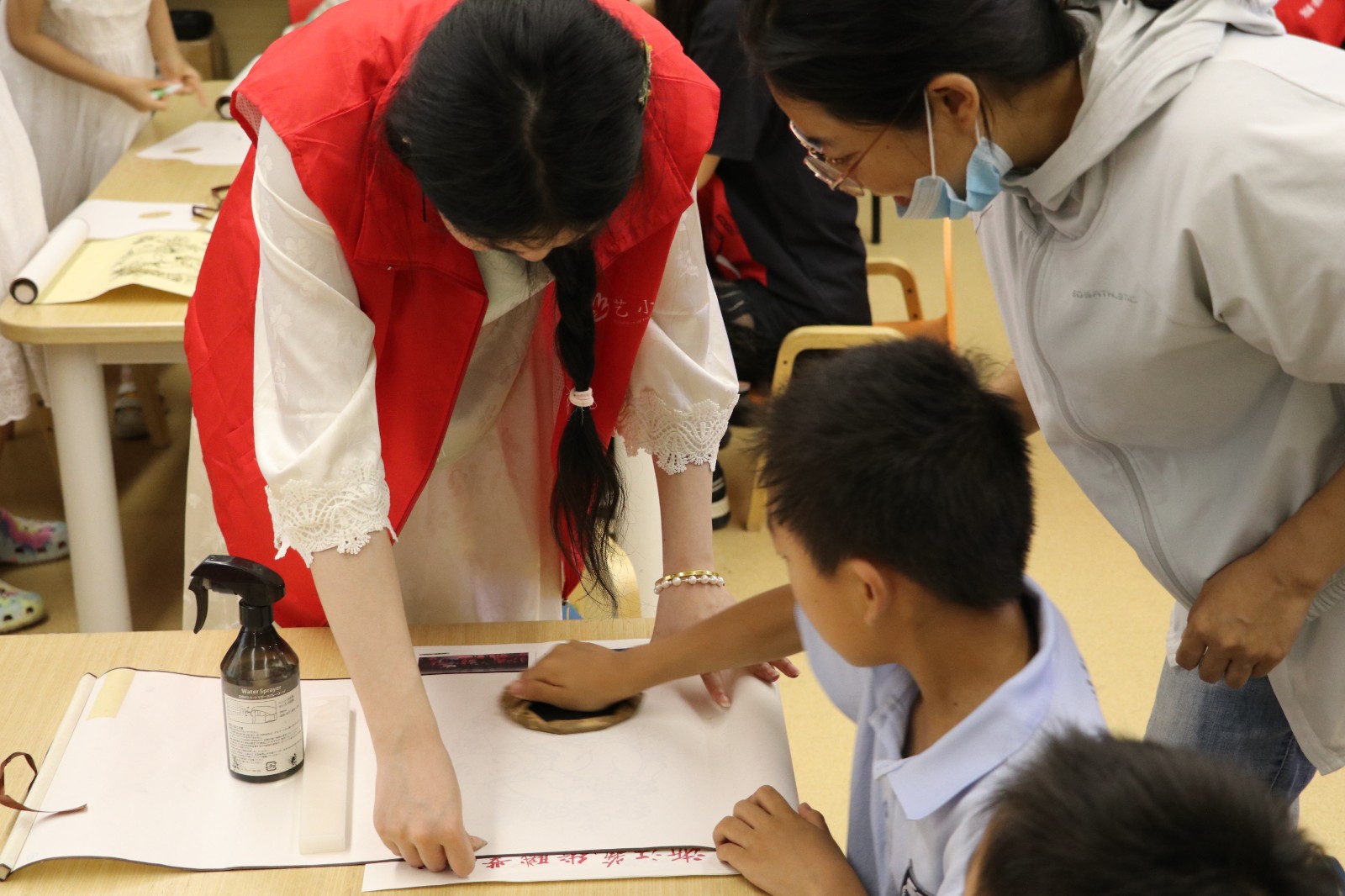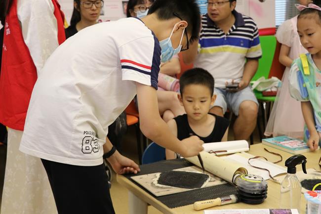 在水印木刻体验中,“艺小匠”详细讲解了水印木刻的印制流程及印制工具。在“艺小匠”的指导下,参与体验的小朋友们将蘸取墨水的刷子在木板上刷色,均匀涂抹版面,观察好版面的位置后把宣纸对准印版平铺,借助马莲来回旋转按压,使纸面和版面上的墨充分接触。