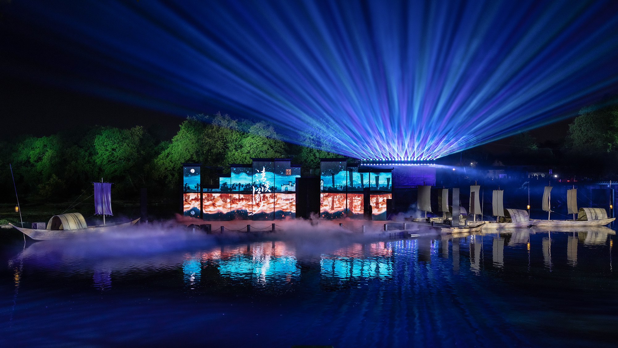 周正平一直对于艺术创作有独特的见解,被中国艺术界誉为“灯光诗人”。本次展览中,周正平的作品有越剧《红玉》和山水剧场《清溪江湖》。《红玉》的灯光设计融入舞美整体空间的韵律,又作为流动的画笔自成体系。在白色调的空灵布景中,使用和谐的色彩和精致的笔触,描绘出简约诗化的情境。在创造意象空间的表现手法上,运用富有张力和节奏感的光影,既刻画了表演动作,又强化了全女班演员在武戏上的阳刚气质。将繁复的技术手段和凝练的艺术构思隐藏在诗意画面背后,通过光形成视觉语汇,与观众进行情绪对话。在《清溪江湖》中,周正平让视觉艺术进入清湖古镇的整体公共空间,既是对沉睡着的江山文化的唤醒,也是他游走半生对故乡的献礼。