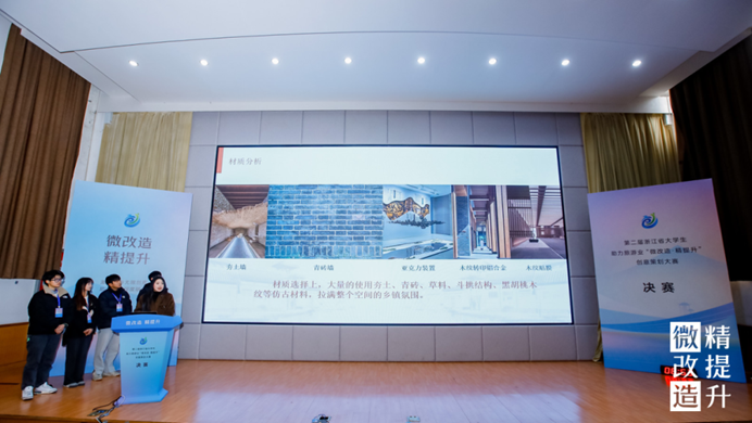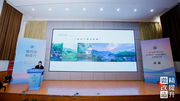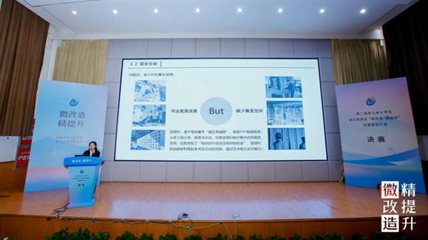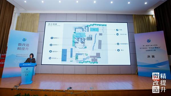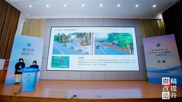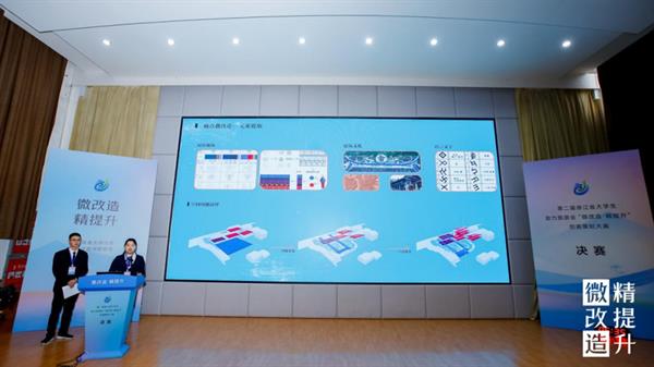 决赛现场,12组入围作品的选手代表依次上台,结合PPT和视频讲解,紧扣项目需求和设计的现实意义,对设计的整体方案、创意思路、专业知识运用等多方面进行陈述和答辩,聚焦“微改造 精提升”成果,展开激烈对决。