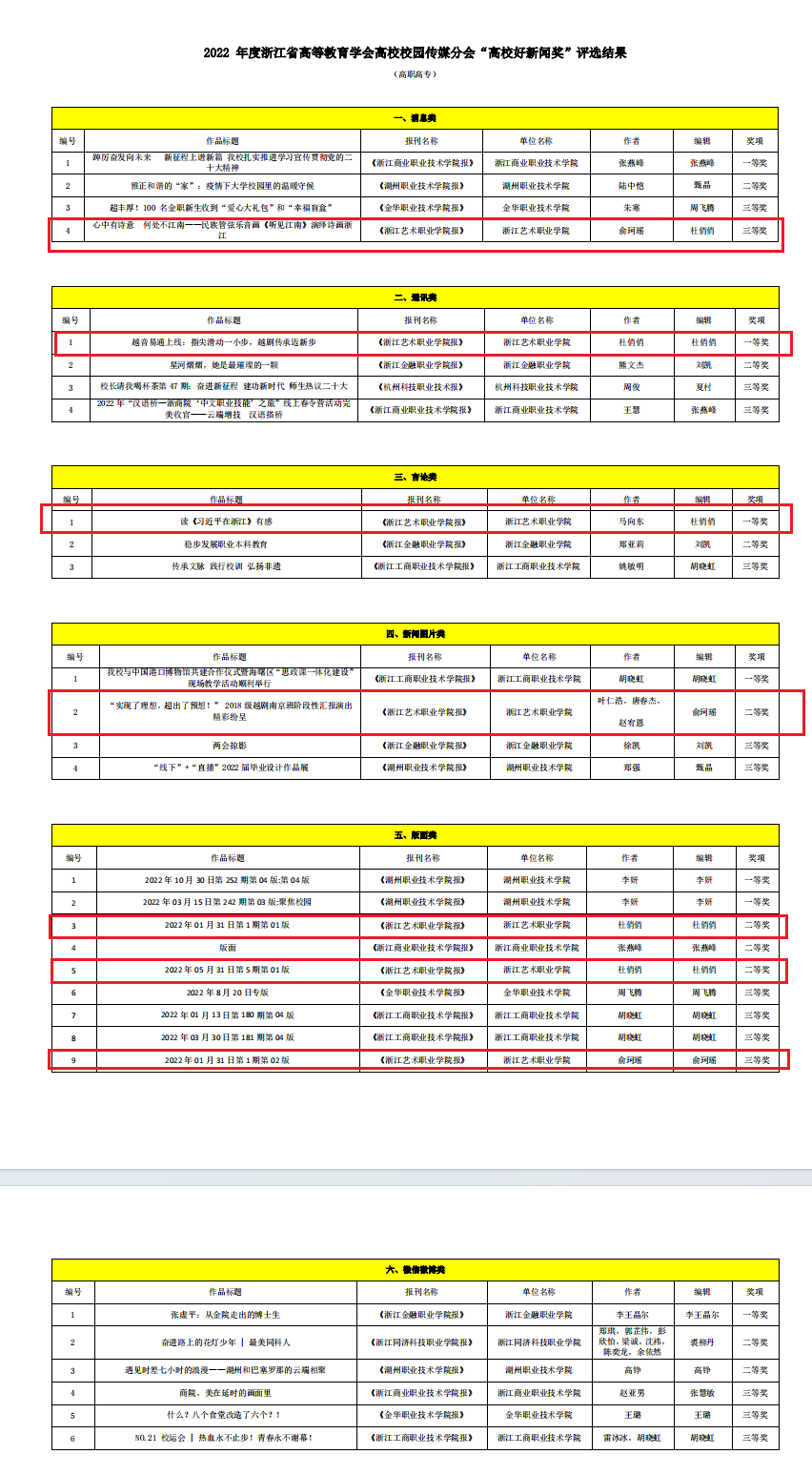 近日,经浙江省新闻工作者协会、浙江省高等教育学会高校校园传媒分会评审,2022年度浙江省高校好新闻作品评选结果出炉,评选出消息类、通讯类、言论类、新闻图片类、版面类、微信微博类一、二、三等奖。我校7个作品获奖。其中一等奖2项,二等奖3项,三等奖2项,在全省同类院校中获奖数量排名第一。